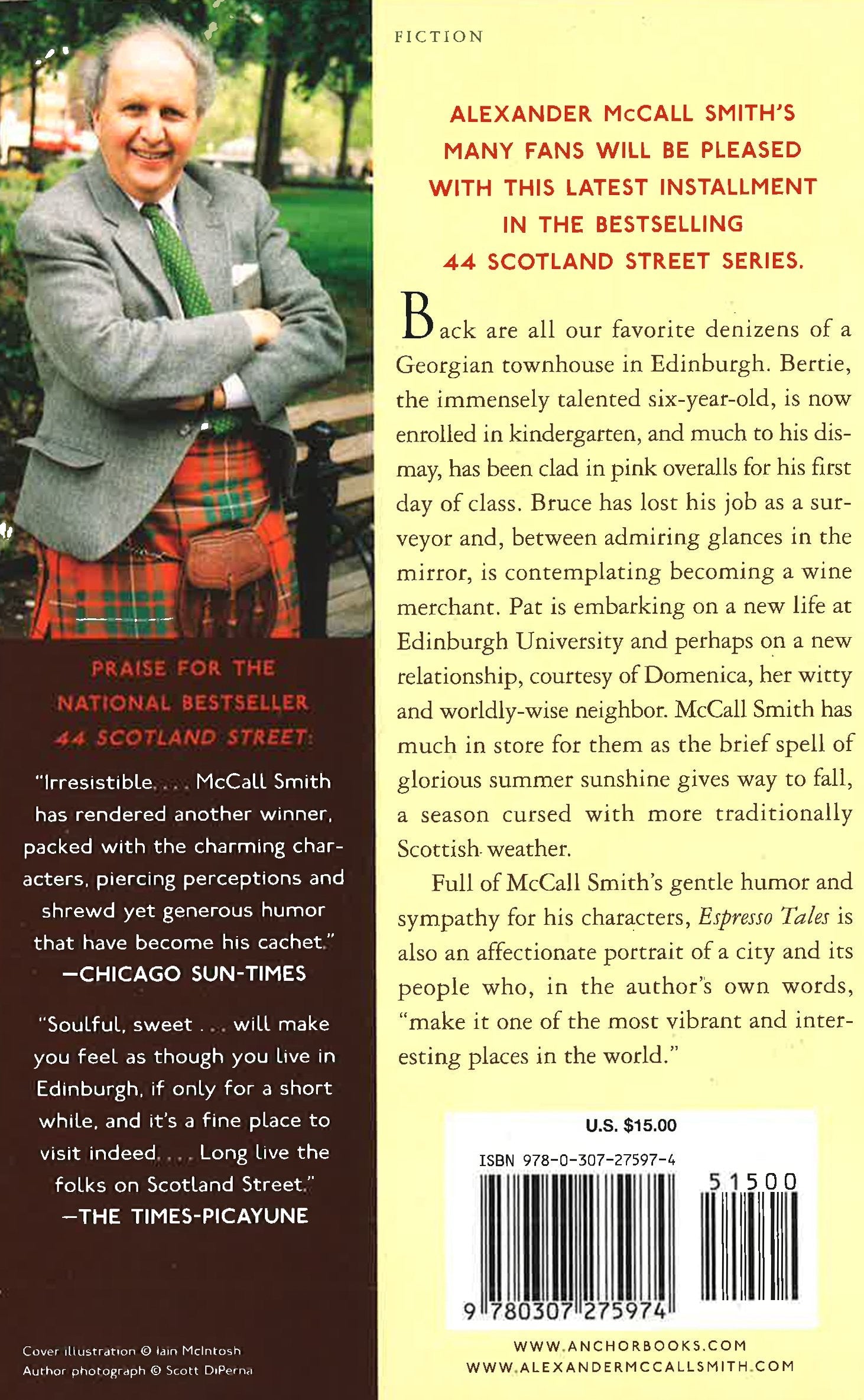 44 SCOTLAND STREET - Book 2 The residents and neighbors of 44 Scotland Street and the city of Edinburgh come to vivid life in these gently satirical, wonderfully perceptive serial novels, featuring six-year-old Bertie, a remarkably precocious boy?just ask his mother. Back are all our favorite denizens of a Georgian townhouse in Edinburgh. Bertie the immensely talented six year old is now enrolled in kindergarten, and much to his dismay, has been clad in pink overalls for his first day of class. Bruce has lost his job as a surveyor, and between admiring glances in the mirror, is contemplating becoming a wine merchant. Pat is embarking on a new life at Edinburgh University and perhaps on a new relationship, courtesy of Domenica, her witty and worldly-wise neighbor. McCall Smith has much in store for them as the brief spell of glorious summer sunshine gives way to fall a season cursed with more traditionally Scottish weather. Full of McCall Smith?s gentle humor and sympathy for his characters, Espresso Tales is also an affectionate portrait of a city and its people who, in the author?s own words, ?make it one of the most vibrant and interesting places in the world.?