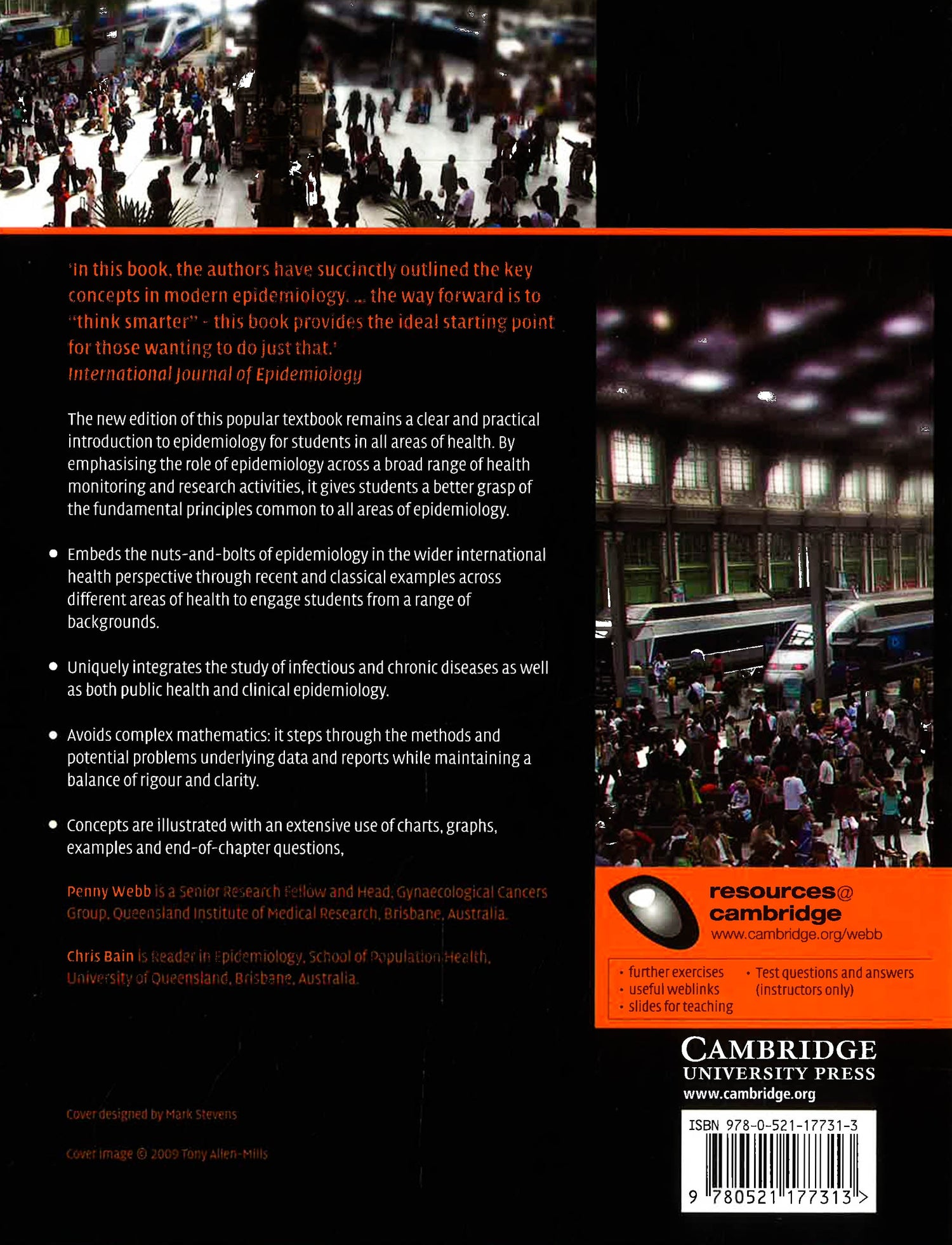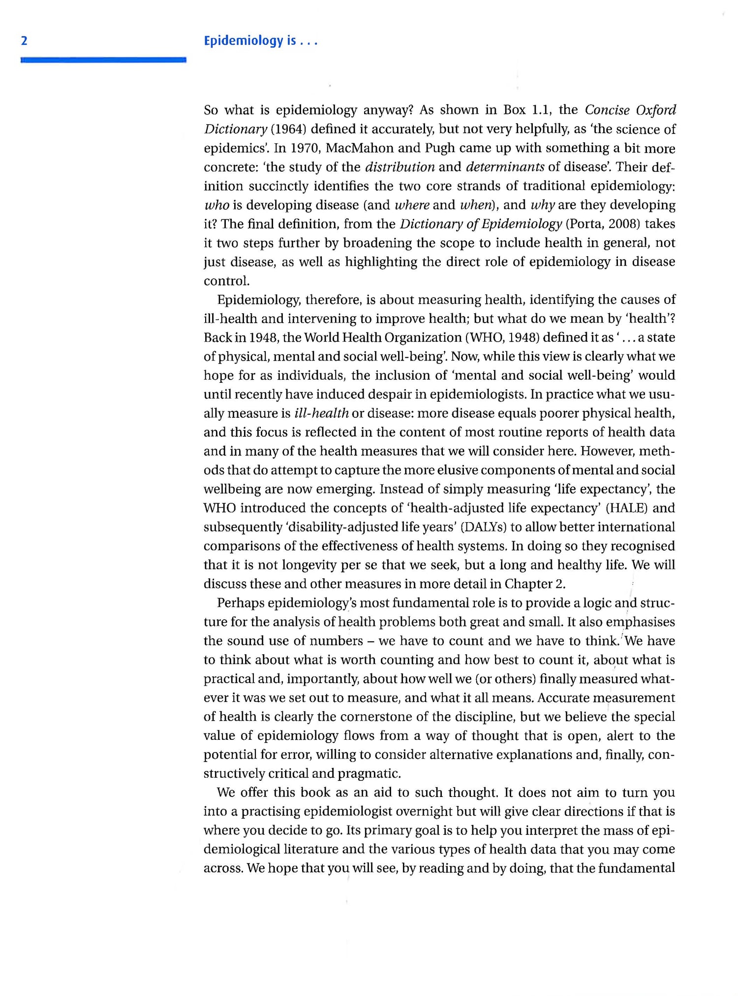 The new edition of this popular textbook remains a clear and practical introduction to epidemiology for students in all areas of health. By emphasising the role of epidemiology across a broad range of health monitoring and research, it gives students an understanding of the fundamental principles common to all areas of epidemiology. It also integrates the study of infectious and chronic diseases as well as public health and clinical epidemiology. Avoiding complex mathematics, it steps through the methods and potential problems underlying health data and reports, while maintaining a balance of rigour and clarity. The nuts-and-bolts of epidemiology are embedded in the wider international health perspective through recent and classical examples across different areas of health to engage students from a range of backgrounds. Concepts are illustrated with charts and graphs, and end-of-chapter questions test understanding (with answers provided). Online resources include further exercises, slides for teaching and useful weblinks.