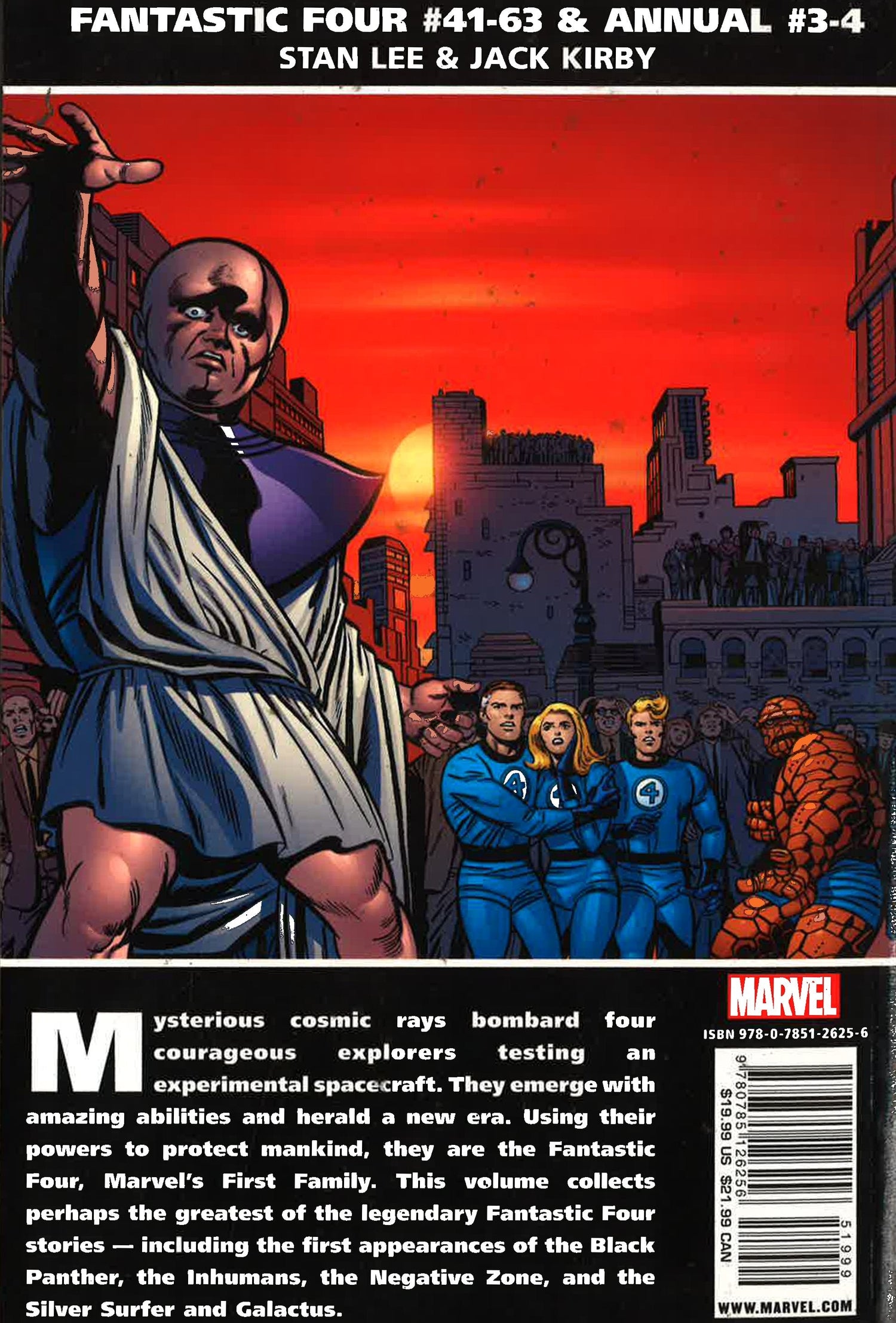 Mysterious cosmic rays bombard four courageous explorers testing an experimental spacecraft. They emerge with amazing abilities and herald a new era. Using their powers to protect mankind, they are the Fantastic Four, Marvel's First Family! This volume collects perhaps the greatest of the legendary Fantastic Four stories--including the first ever appearances of the Black Panther, the Inhumas, the Negative Zone and the Silver Surfer and Galactus! COLLECTING: FANTASTIC FOUR (1961) 41-63; ANNUAL 3-4