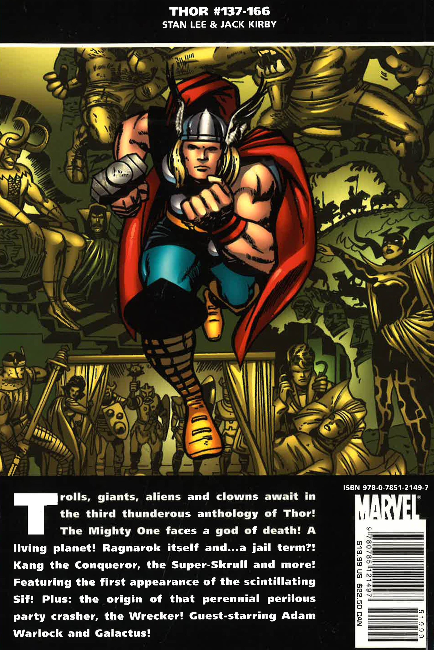 Trolls, giants, aliens and clowns await in the third thunderous anthology of Thor! The Mighty One faces a god of death! A living planet! Ragnarok itself and...a jail term!? Kang the Conqueror, the Super-Skrull and more! Featuring the first appearance of the scintillating Sif! Plus: the origin of that perennial perilous party crasher, the Wrecker! Guest-starring Adam Warlock and Galactus!