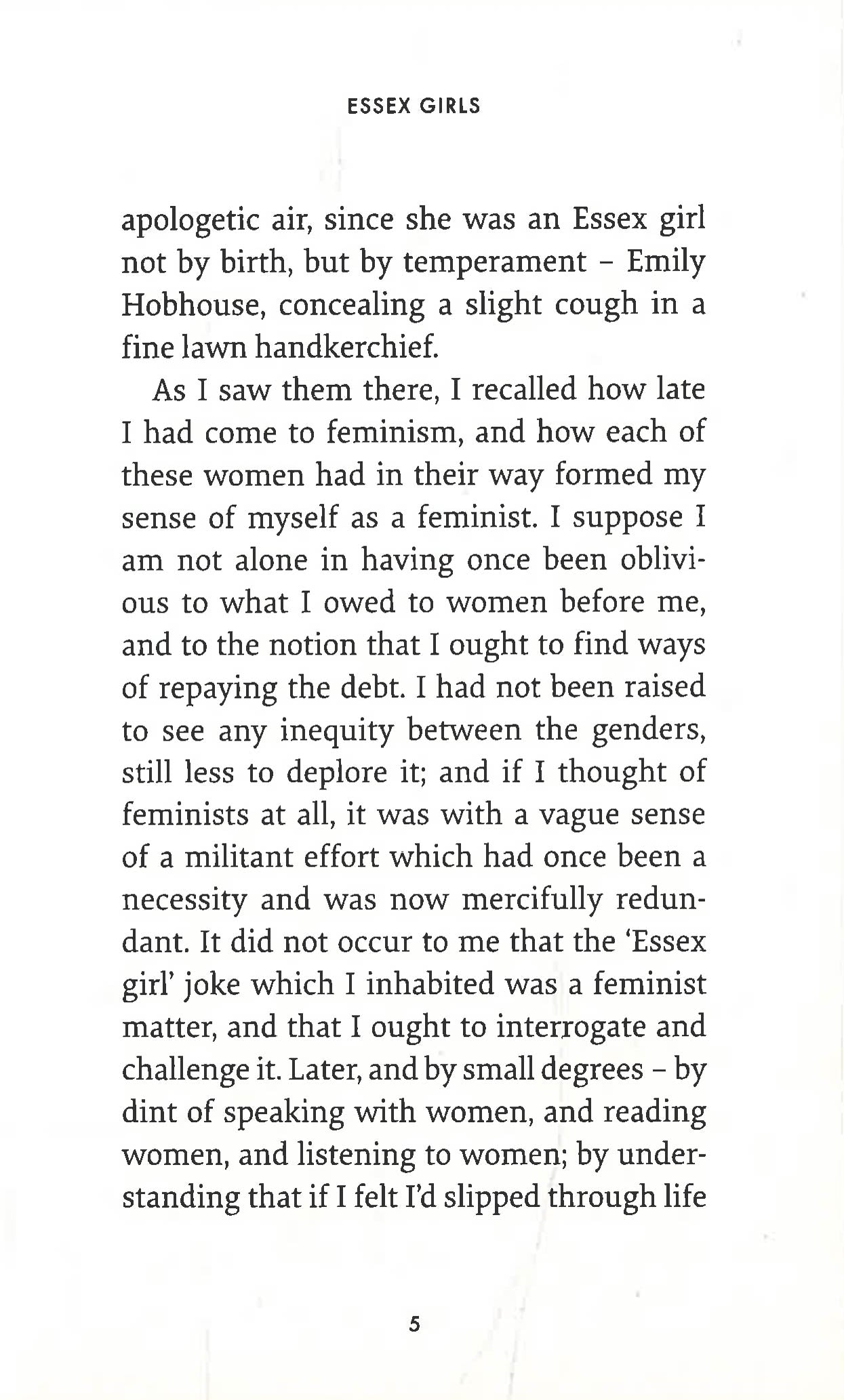 Essex Girls are disreputable, disrespectful and disobedient. They speak out of turn, too loudly and too often, in an accent irritating to the ruling classes. Their bodies are hyper-sexualised and irredeemably vulgar. They are given to intricate and voluble squabbling. They do not apologise for any of this. And why should they? In this exhilarating feminist defence of the Essex girl, Sarah Perry re-examines her relationship with her much maligned home county. She summons its most unquiet spirits, from Protestant martyr Rose Allin to the indomitable Abolitionist Anne Knight, sitting them alongside Audre Lorde, Kim Kardashian and Harriet Martineau, and showing us that the Essex girl is not bound by geography. She is a type, representing a very particular kind of female agency, and a very particular kind of disdain: she contains a multitude of women, and it is time to celebrate them.