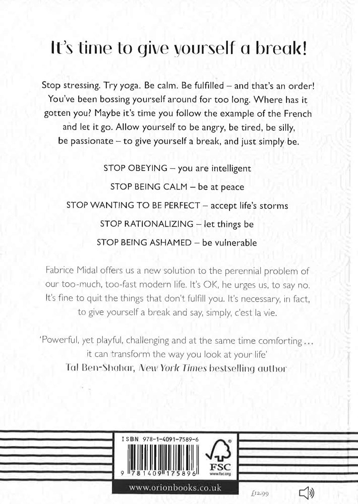 Offers a fresh approach to meditation that explains why the key to mindfulness is freeing ourselves from the things in our lives that are causing us stress and anxiety - and how to finally give ourselves a break in this frenetic, relentless world.THE INTERNATIONAL BESTSELLER'The book's motto - give yourself a break! - is perhaps the most radical resolution of the year' ElleIt's time to give yourself a break!You've been bossing yourself around for too long. Where has it gotten you? Maybe it's time you follow the example of the French and let it go. Allow yourself to be angry, be tired, be silly, be passionate - to give yourself a break, and just simply be.Fabrice Midal offers us a new solution to the perennial problem of our too-much, too-fast modern life. It's OK, he urges us, to say no. It's fine to quit the things that don't fulfill you. It's necessary, in fact, to give yourself a break and say, simply, c'est la vie.'All the talk of Paris' Evening Standard'A roadmap for avoiding the perils of perfectionism' Get the Gloss'Powerful, yet playful, challenging and at the same time comforting . . . it can transform the way you look at your life' Tal Ben-Shahar, New York Times bestselling author