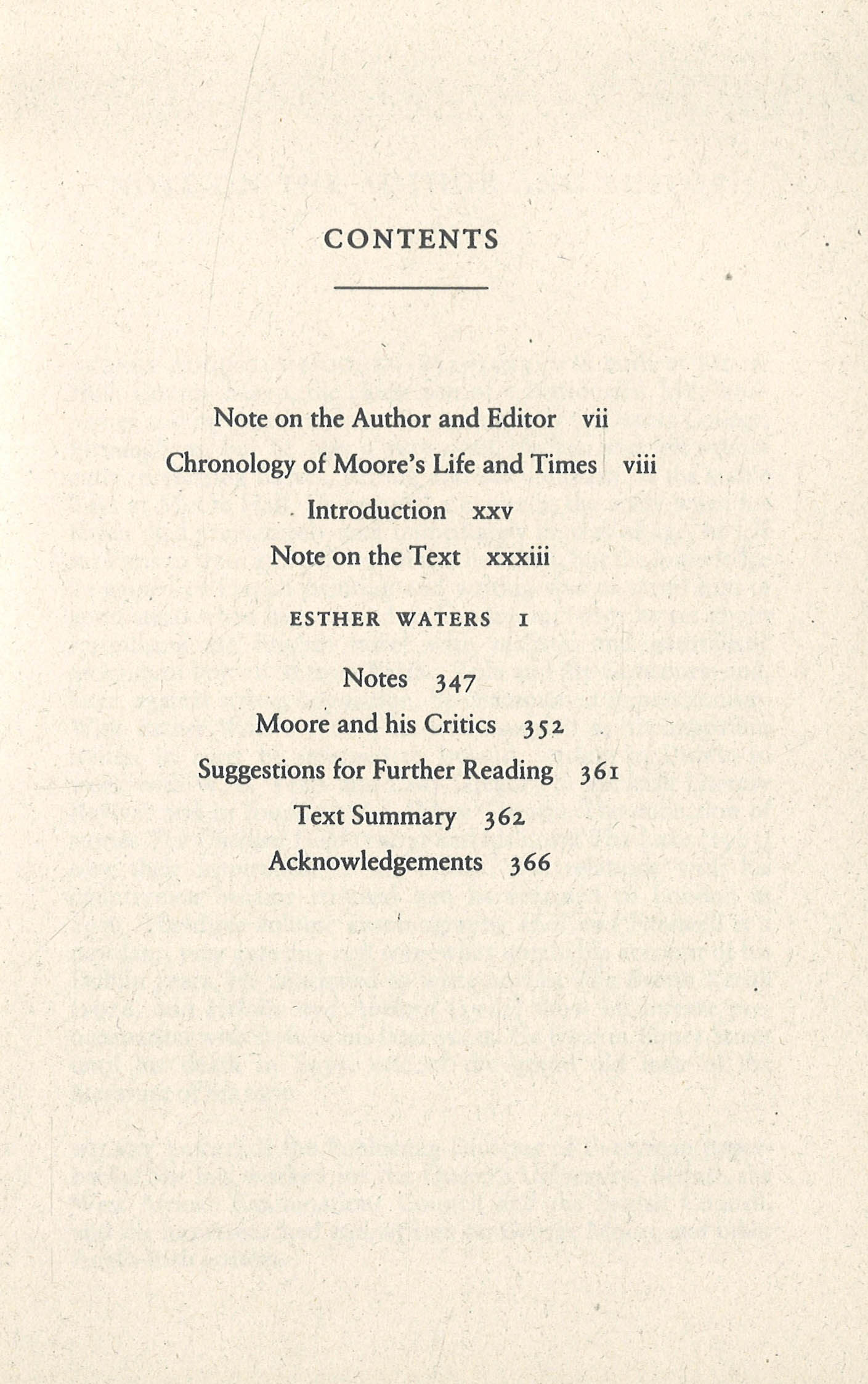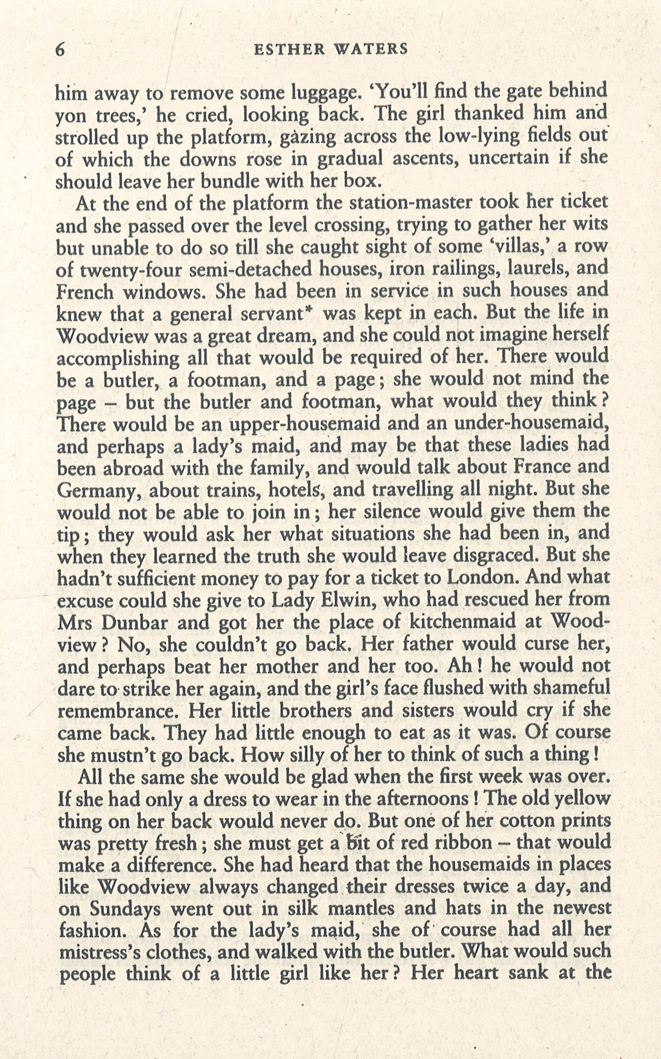 “She stood on the platform watching the receding train. A few bushes hid the curve of the line; the white vapour rose above them, evaporating in the pale evening. A moment more and the last carriage would pass out of sight. The white gates swung forward slowly and closed over the line”. Thus opens the novel about Esther Waters, young, pious woman from a poor working class family who, while working as a kitchen maid, is seduced by another employee, becomes pregnant, is deserted by her lover, and against all odds decides to raise her child as a single mother. Esther Waters is one of a group of Victorian novels that depict the life of a “fallen woman”. It is considered to be Moore’s best novel. Moore lived from 1852 to 1933.