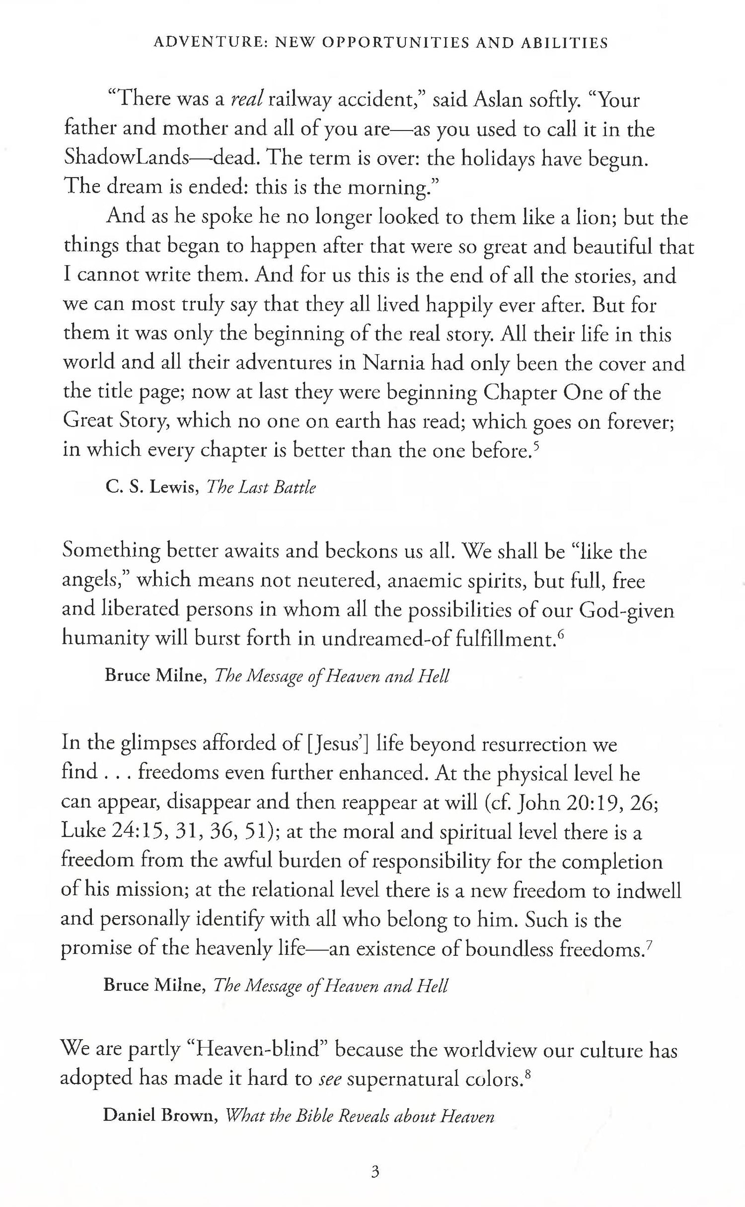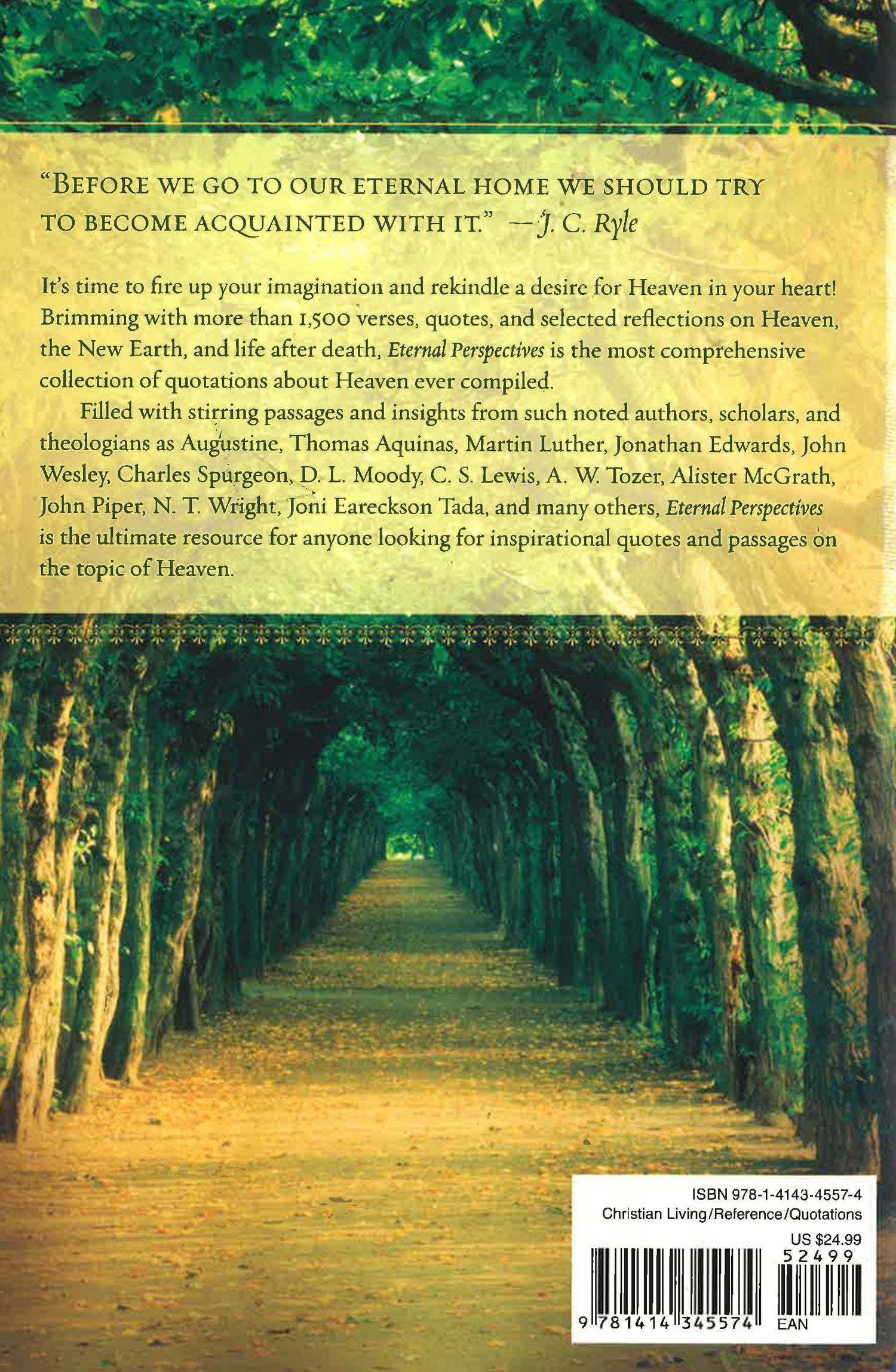 It's time to fire up your imagination and rekindle a desire for Heaven in your heart! Brimming with verses, quotes, and selected passages on the topic of Heaven, the New Earth, and life after death, Eternal Perspectives is the most comprehensive collection of quotations about Heaven ever compiled. Pulling from noted authors, scholars, and theologians such as C.S. Lewis, Charles Spurgeon, Jonathan Edwards, Alister McGrath, Martin Luther, Augustine, Max Lucado, Philip Yancey, D. L. Moody, Dallas Willard, and countless others, Eternal Perspectives is the ultimate resource for anyone looking for inspirational quotes and passages on the topic of Heaven. Whether you choose to skip around or read the volume straight through, these profound and enlightening insights will help you draw closer to the One who made you for himself, and deepen your desire for the place he is making for you, and where he wants to live with you throughout eternity.