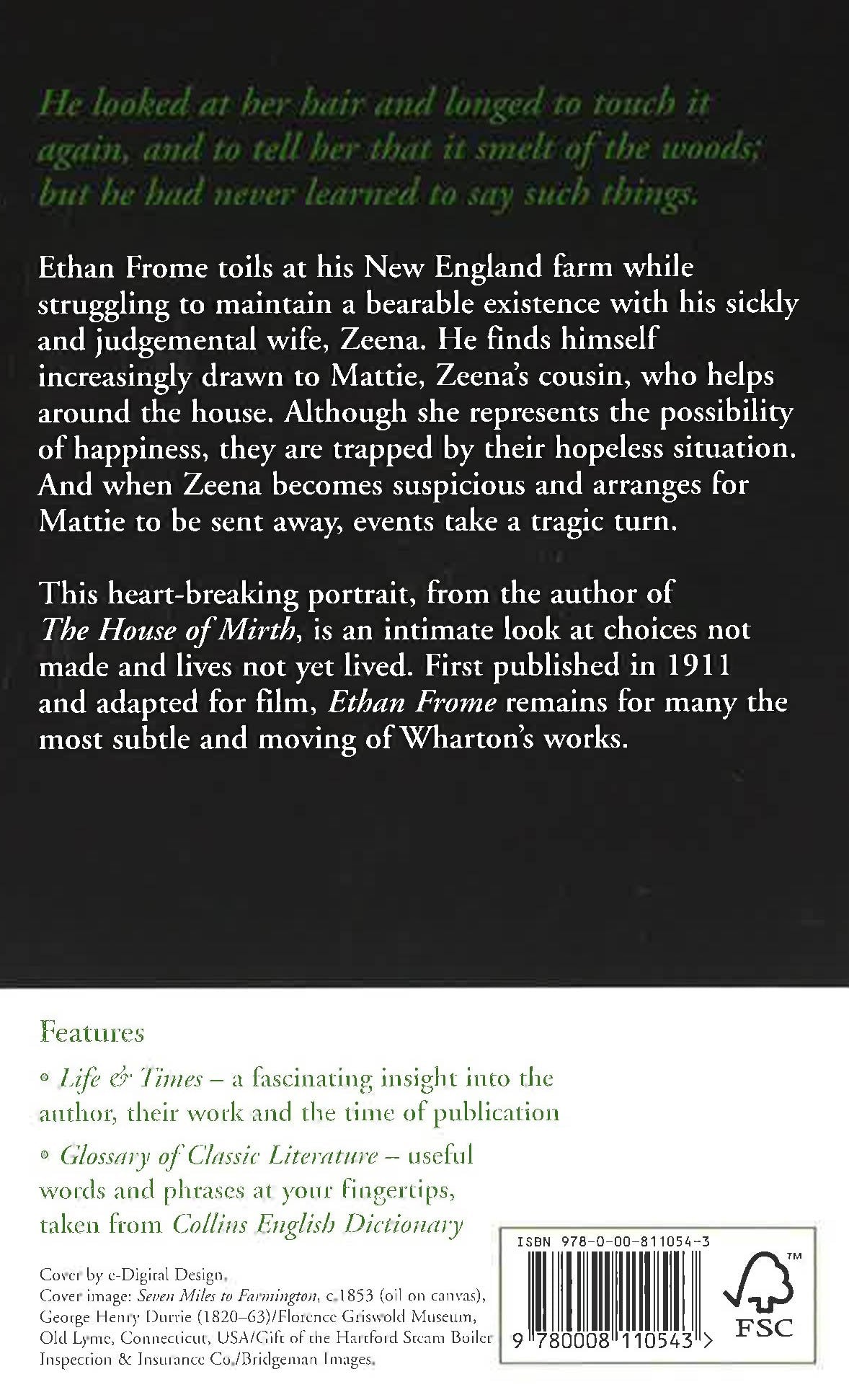 HarperCollins is proud to present its incredible range of best-loved, essential classics. `He looked at her hair and longed to touch it again, and to tell her that it smelt of the woods; but he had never learned to say such things...' One harsh winter in 1900s New England, Ethan Frome toils at his farm while struggling to maintain a bearable existence with his forbidding wife, Zeena. When Ethan takes Zeena's cousin, Mattie, home from a dance he is entranced: Mattie brings with her the possibility for happiness, and with that she quickly becomes a symbol of hope for Ethan. First published in 1911, Ethan Frome is an intimate look at choices not made and lives not yet lived. Told through the eyes of a city outsider, this heartbreaking portrait of three lives haunted by thwarted dreams remains for many the most subtle and moving of Wharton's works.