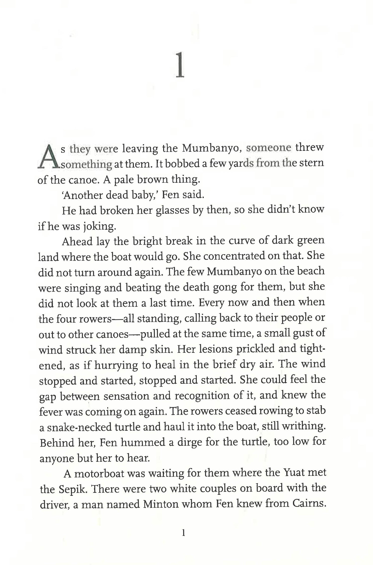 English anthropologist Andrew Bankson has been alone in the field for several years, studying the Kiona river tribe in the Territory of New Guinea. Haunted by the memory of his brothers’ deaths and increasingly frustrated and isolated by his research, Bankson is on the verge of suicide when a chance encounter with colleagues, the controversial Nell Stone and her wry and mercurial Australian husband Fen, pulls him back from the brink. Nell and Fen have just fled the bloodthirsty Mumbanyo and, in spite of Nell’s poor health, are hungry for a new discovery. When Bankson finds them a new tribe nearby, the artistic, female-dominated Tam, he ignites an intellectual and romantic firestorm between the three of them that burns out of anyone’s control.