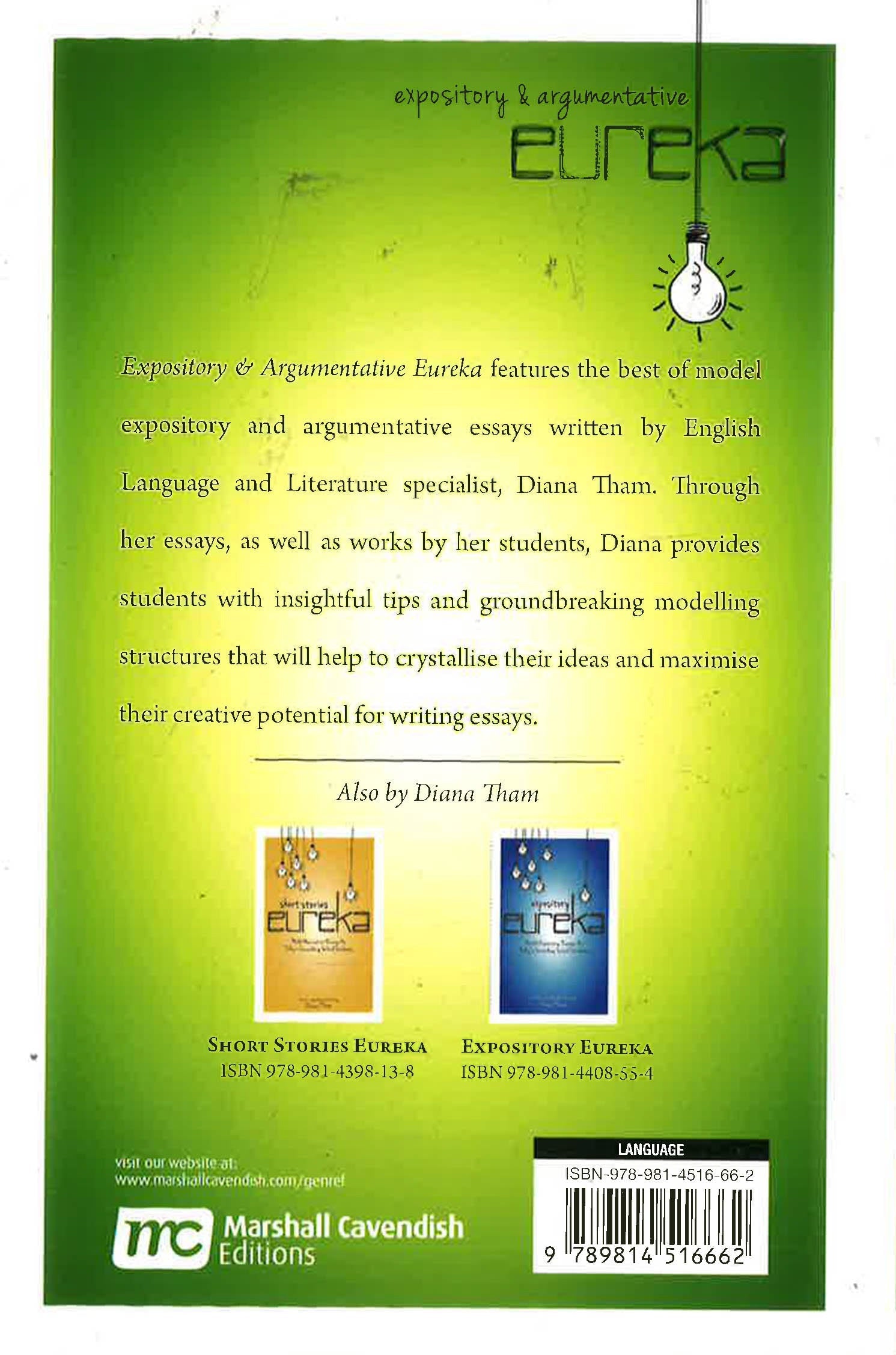 Expository and Argumentative Essays Eureka features the best of model expository and argumentative stories written by English Language and Literature specialist, Diana Tham. Through her essays, as well as works by her students, Diana shows students how to apply model structures and writing techniques to their own writing, providing them with strategies that will help to crystallise their ideas and realise their potential. Using these essays as a guide, students will be able to hone the necessary writing skills they need to ensure exceptional scores in any examination.
