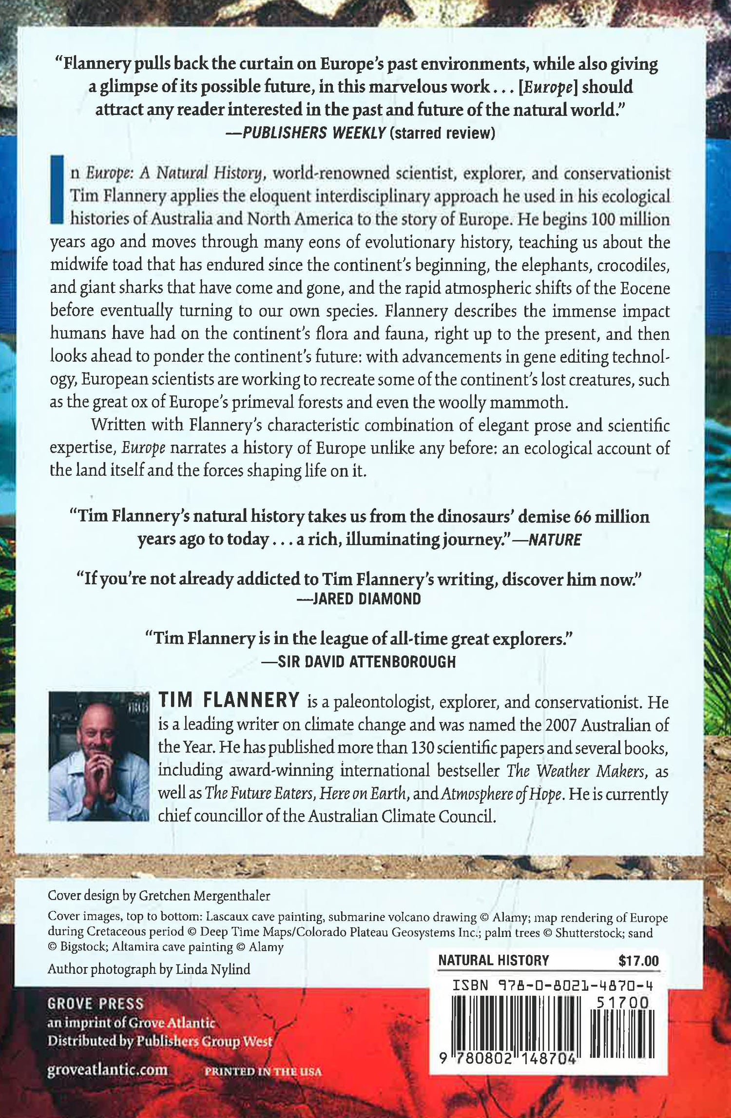 As the story moves through millions of years of evolutionary history, Flannery eventually turns to our own species, describing the immense impact humans had on the continent's flora and fauna--within 30,000 years of our arrival in Europe, the woolly rhino, the cave bear, and the giant elk, among others, would disappear completely. The story continues right up to the present, as Flannery describes Europe's leading role in wildlife restoration, and then looks ahead to ponder the continent's future: with advancements in gene editing technology, European scientists are working to recreate some of the continent's lost creatures, such as the great ox of Europe's primeval forests and even the woolly mammoth.