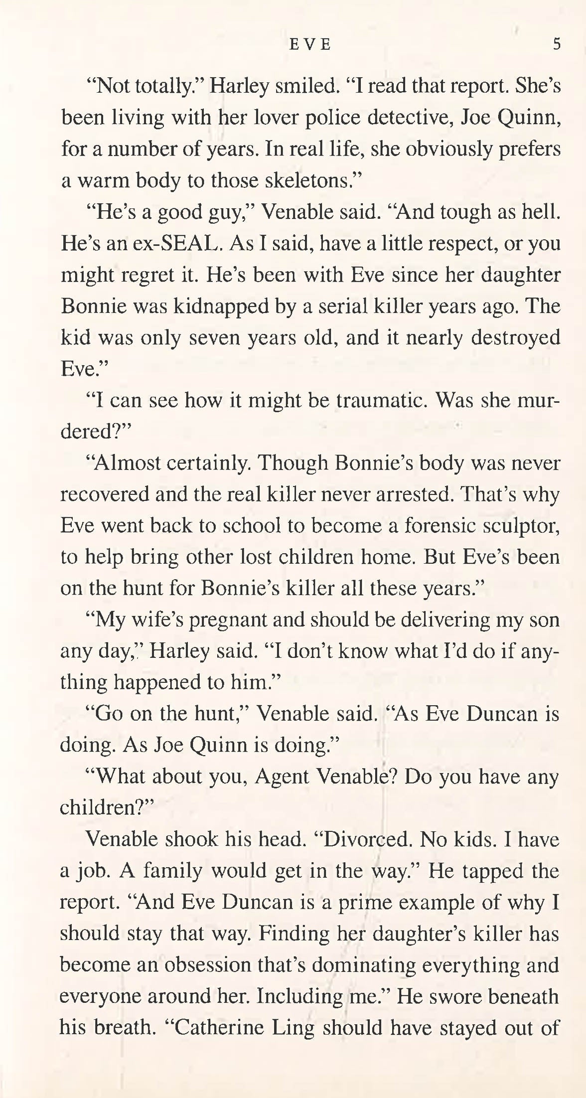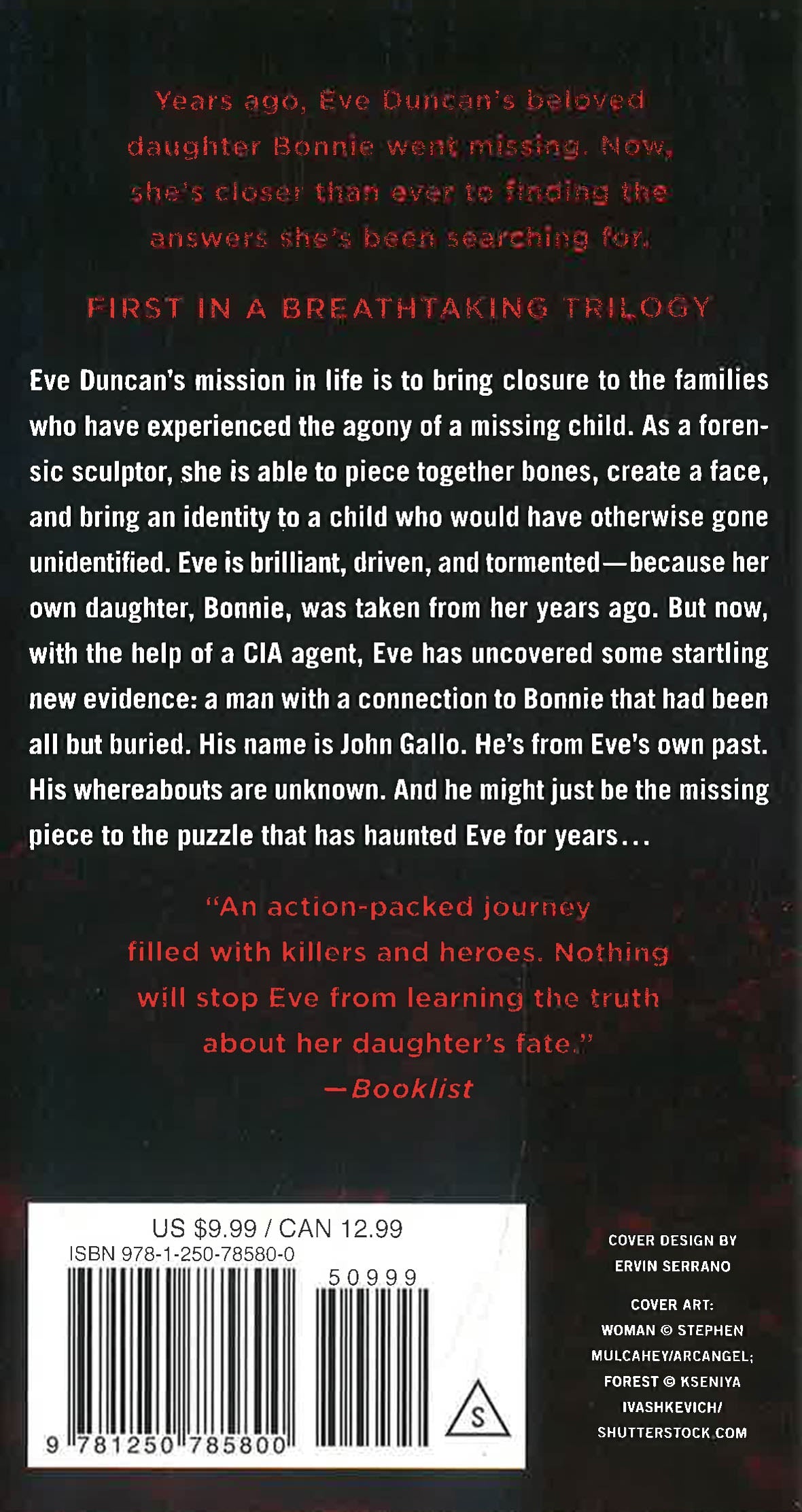Eve Duncan's mission in life is to bring closure to the families who have experienced the agony of a missing child. As a forensic sculptor, she is able to piece together bones, create a face, and bring an identity to a child who would have otherwise gone unidentified. Eve is brilliant, driven, and tormented—because her own daughter, Bonnie, was taken from her years ago. But now, with the help of a CIA agent, Eve has uncovered some startling new evidence: A man with a connection to Bonnie that had been all but buried. His name is John Gallo. He's from Eve's own past. His whereabouts are unknown. And he might just be the missing piece to the puzzle that has haunted Eve for years…