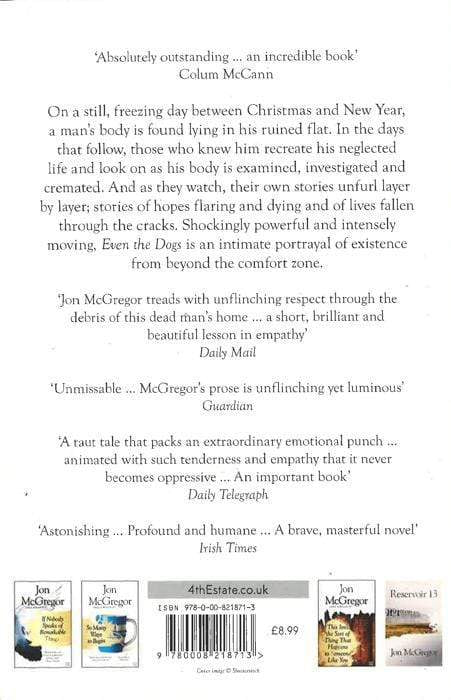 WINNER OF THE 2012 IMPAC DUBLIN AWARD On a cold, quiet day between Christmas and the New Year, a man's body is found in an abandoned apartment. His friends look on, but they're dead, too. Their bodies found in squats and sheds and alleyways across the city. Victims of a bad batch of heroin, they're in the shadows, a chorus keeping vigil as the hours pass, paying their own particular homage as their friend's body is taken away, examined, investigated, and cremated.All of their stories are laid out piece by broken piece through a series of fractured narratives. We meet Robert, the deceased, the only alcoholic in a sprawling group of junkies; Danny, just back from uncomfortable holidays with family, who discovers the body and futiley searches for his other friends to share the news of Robert's death; Laura, Robert's daughter, who stumbles into the junky's life when she moves in with her father after years apart; Heather, who has her own place for the first time since she was a teenager; Mike, the Falklands War vet; and all the others.Theirs are stories of lives fallen through the cracks, hopes flaring and dying, love overwhelmed by a stronger need, and the havoc wrought by drugs, distress, and the disregard of the wider world. These invisible people live in a parallel reality, out of reach of basic creature comforts, like food and shelter. In their sudden deaths, it becomes clear, they are treated with more respect than they ever were in their short lives.Intense, exhilarating, and shot through with hope and fury, Even the Dogs is an intimate exploration of life at the edges of society - littered with love, loss, despair, and a half-glimpse of redemption.