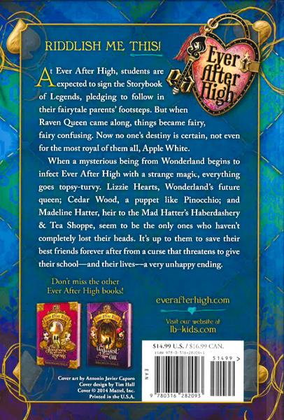 At Ever After High, everyone is expected to sign the "Storybook of Legends," pledging to follow in their fairytale parent's footsteps. But when Raven Queen came along, things became fairy, fairy confusing. Now no one's destiny is certain, not even for the most royal of them all, Apple White.When a mysterious being from Wonderland begins to infect Ever After High with a strange magic, everything goes topsy-turvy. The students transform into animals and objects, palace mice talk, and the beautiful green grounds on campus fade to black-and-white. Lizzie Hearts, Wonderland's future queen, Cedar Wood, daughter of Pinocchio, and Madeline Hatter, heir to the Mad Hatter's Hat and Tea Shoppe, seem to be the only ones who haven't completely lost their heads. It's up to them to save their best friends forever after from a curse that threatens to give their school-and their lives-a very unhappy ending.Don't miss Book #1, "Ever After High: Storybook of Legends" and Book #2, "Ever After High: The Unfairest of Them All!