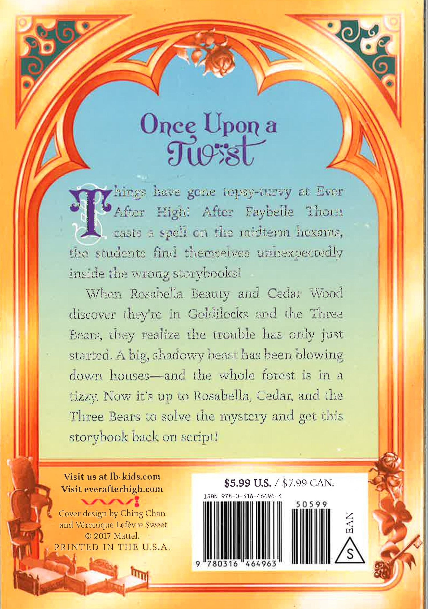 Things have gone topsy-turvy at Ever After High! After Faybelle Thorn casts a spell on the midterm hexams, the students find themselves unhexpectedly inside the wrong storybooks! When Rosabella Beauty and Cedar Wood find themselves in Goldilocks and the Three Bears instead of their own fairytale storybooks, they realize the trouble has only just started. Someone has been blowing down houses-and the whole forest is starting to panic. Now it's up to Rosabella, Cedar, and the Three Bears to solve the mystery and get this storybook back on script! (c)2017 Mattel. All Rights Reserved.