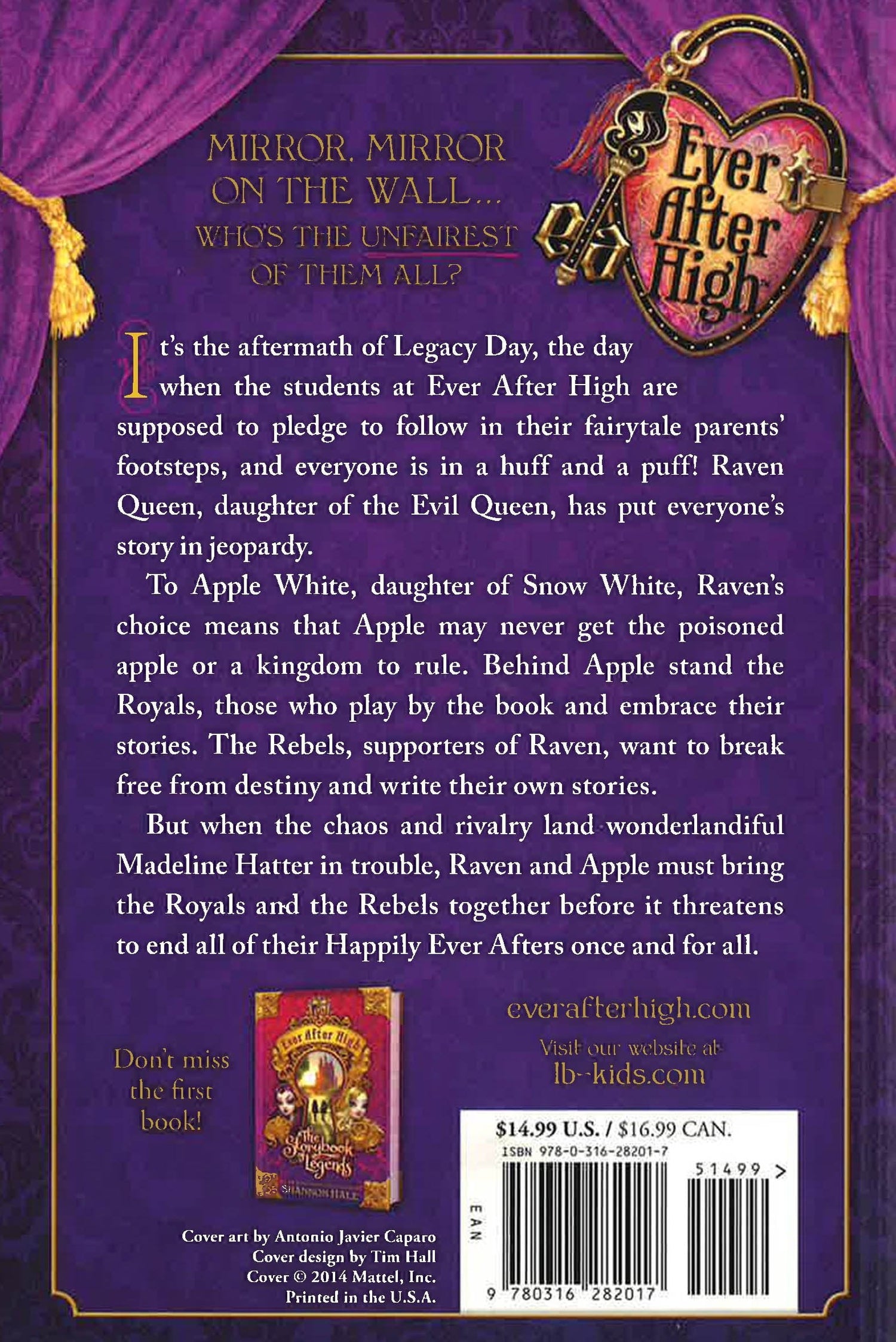 It's the aftermath of Legacy Day, the day when the students at Ever After High are supposed to pledge to follow in their fairytale parents' footsteps, and everyone is in a "huff" and a "puff"! Raven Queen, daughter of the Evil Queen, has refused to sign the Storybook of Legends, rejecting her story--and putting everyone else's in jeopardy. The Royal Apple White doesn't want to think Raven is being a rebellious pain, but Raven's choice means Apple might never get the poisoned apple, Prince Charming, and a kingdom to rule. Behind Apple stands the Royals, those who want to play by the book and embrace their stories. The Rebels, supporters of Raven, believe in breaking free from destiny and writing their own stories. But when the chaos and rivalry land wonderlandiful Madeline Hatter in trouble, Raven and Apple must bring the Royals and the Rebels together to shut the book on their feud before it threatens to end all of their Happily Ever Afters once and for all. "Mirror, Mirror on the Wall...Who'e the Unfairest of Them All?" Don't miss Book #1, "Ever After High: The Storybook of Legends!