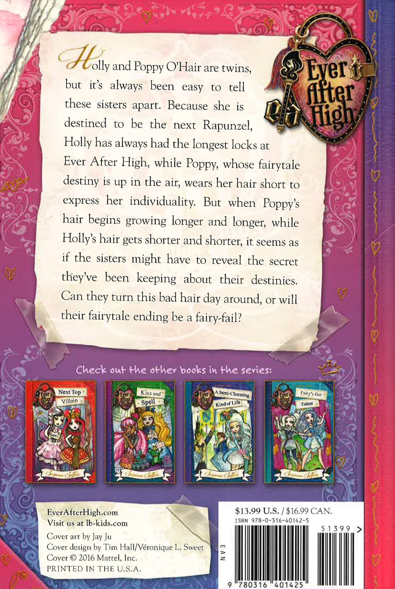 The fifth hexciting book in Suzanne Selfors' Ever After High: A School Story series. Holly and Poppy O'Hair are twins, but it's always been easy to tell these sisters apart. Because she is destined to be the next Rapunzel, Holly has always had the longest locks at Ever After High, while Poppy, whose fairytale destiny is up in the air, wears her hair short to express her individuality. But when Poppy's hair begins growing longer and longer, while Holly's hair gets shorter and shorter, it seems as if the sisters might have to reveal the secret they've been keeping about their destinies. Can they turn this bad hair day around, or will their fairytale ending be a fairy-fail? (c) 2016 Mattel. All Rights Reserved.