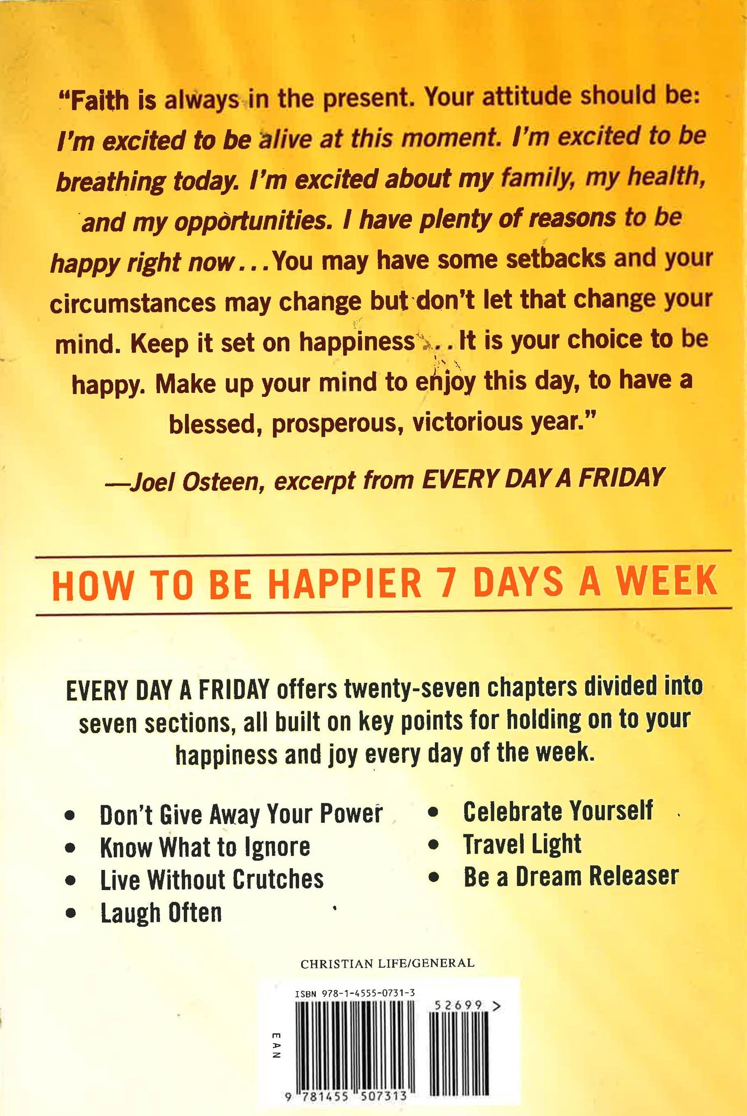 The title comes from research that shows people are happiest on Fridays. Pastor Joel Osteen writes how we can generate this level of contentment and joy every day of the week. Known as a man who maintains a constant positive outlook in spite of circumstances, Osteen has described this message as a core theme of his ministry. Combining his personal experiences with scriptural insights and principles for true happiness, he shows readers how every day can hold the same promise and opportunities for pure joy that they experience at five o'clock on Friday.