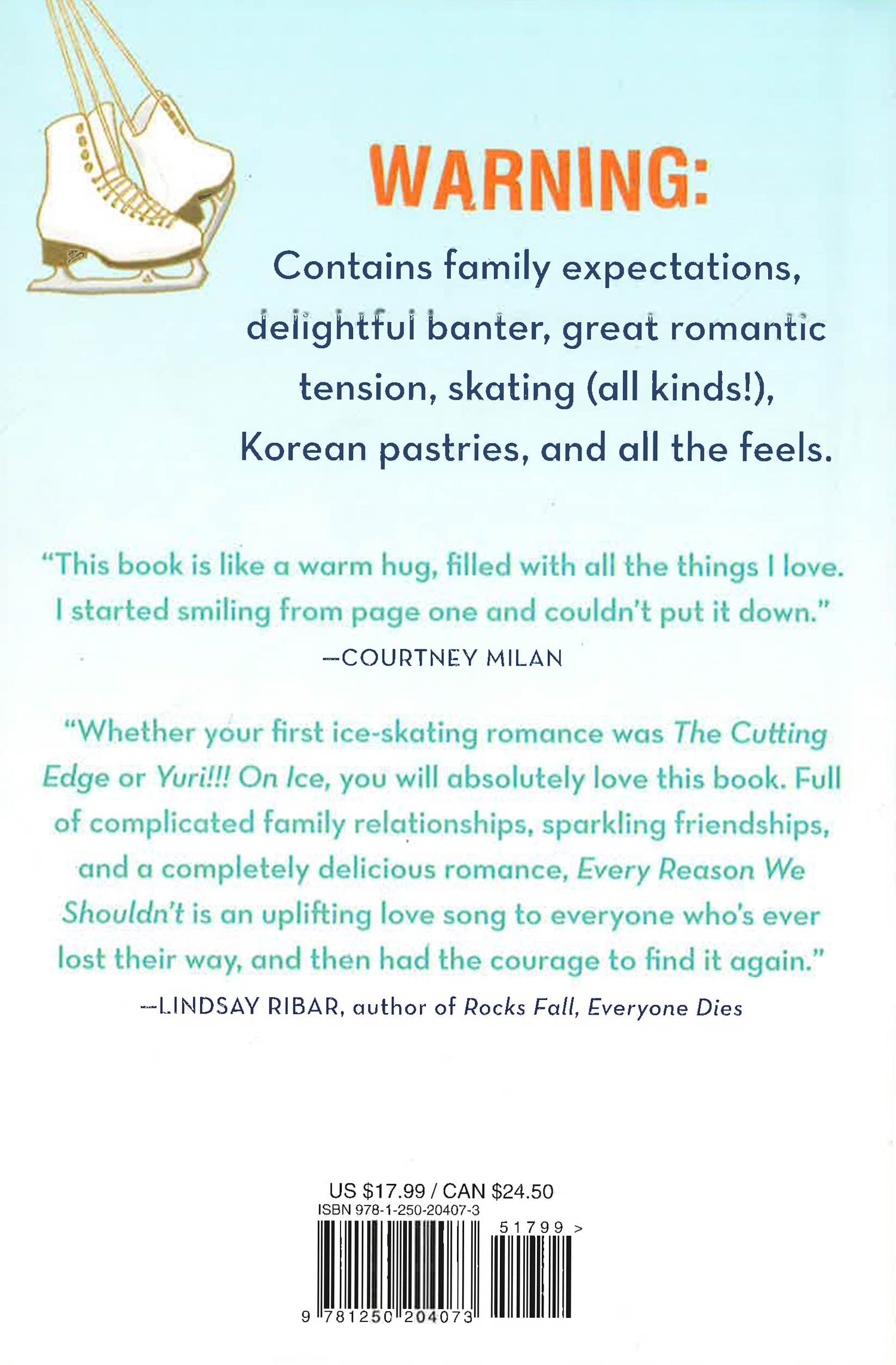Warning: Contains family expectations, delightful banter, great romantic tension, skating (all kinds!), Korean pastries, and all the feels.