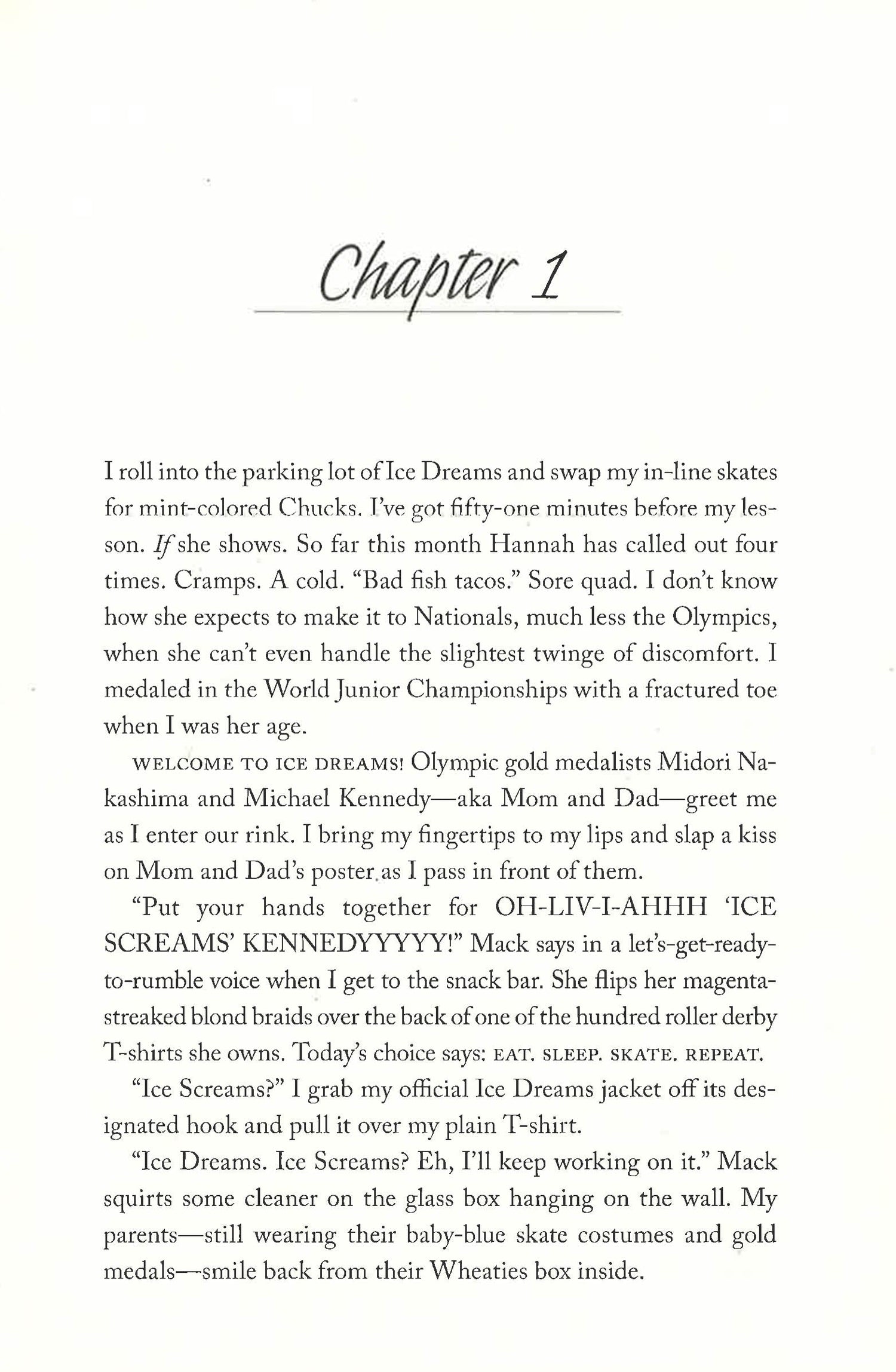 Sixteen-year-old figure skater Olivia Kennedy's Olympic dreams have ended. She's bitter, but enjoying life as a regular teenager instead of trying to live up to expectations of being the daughter of Olympians Michael Kennedy and Midori Nakashima...until Jonah Choi starts training at her family's struggling rink.