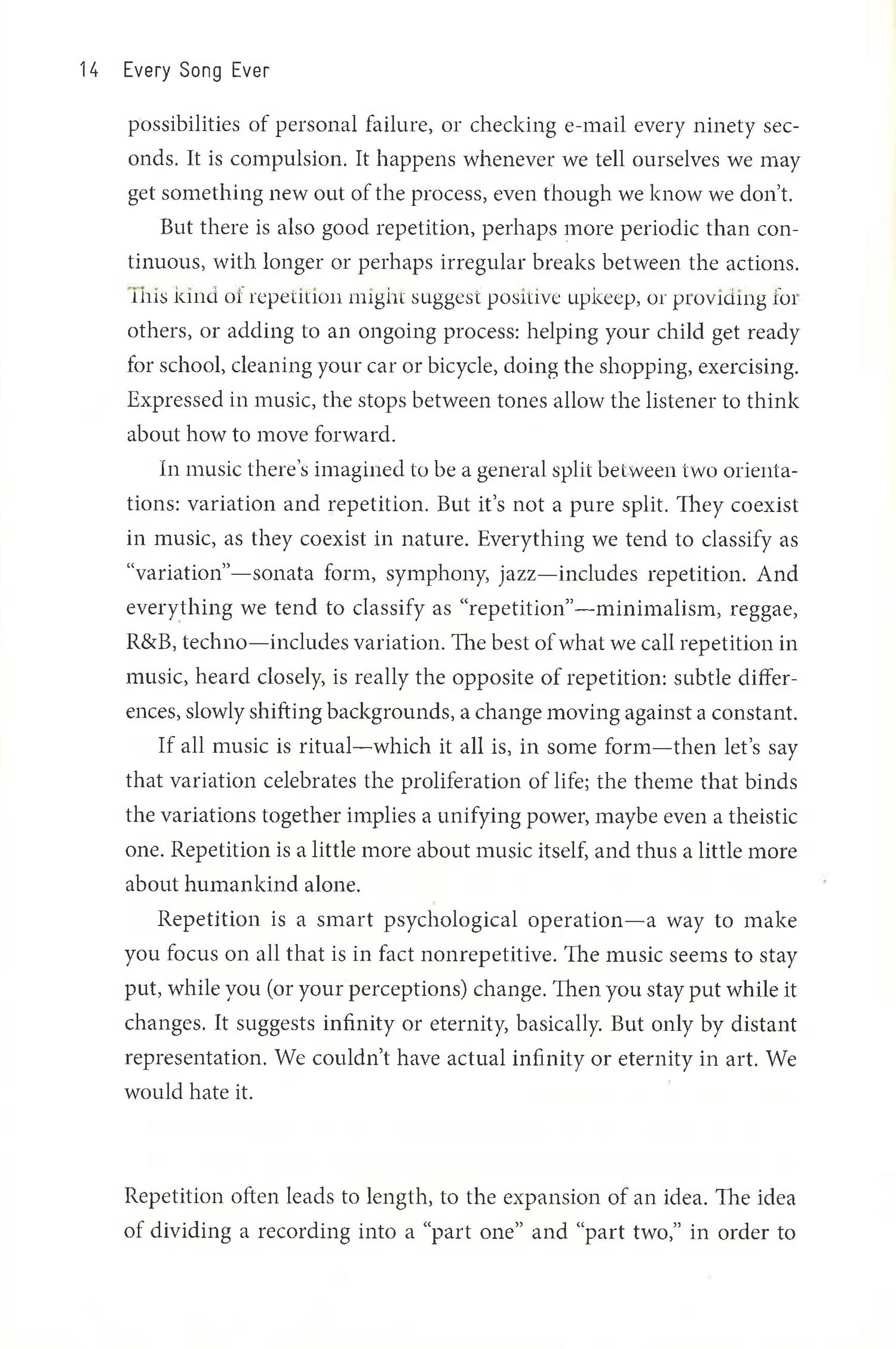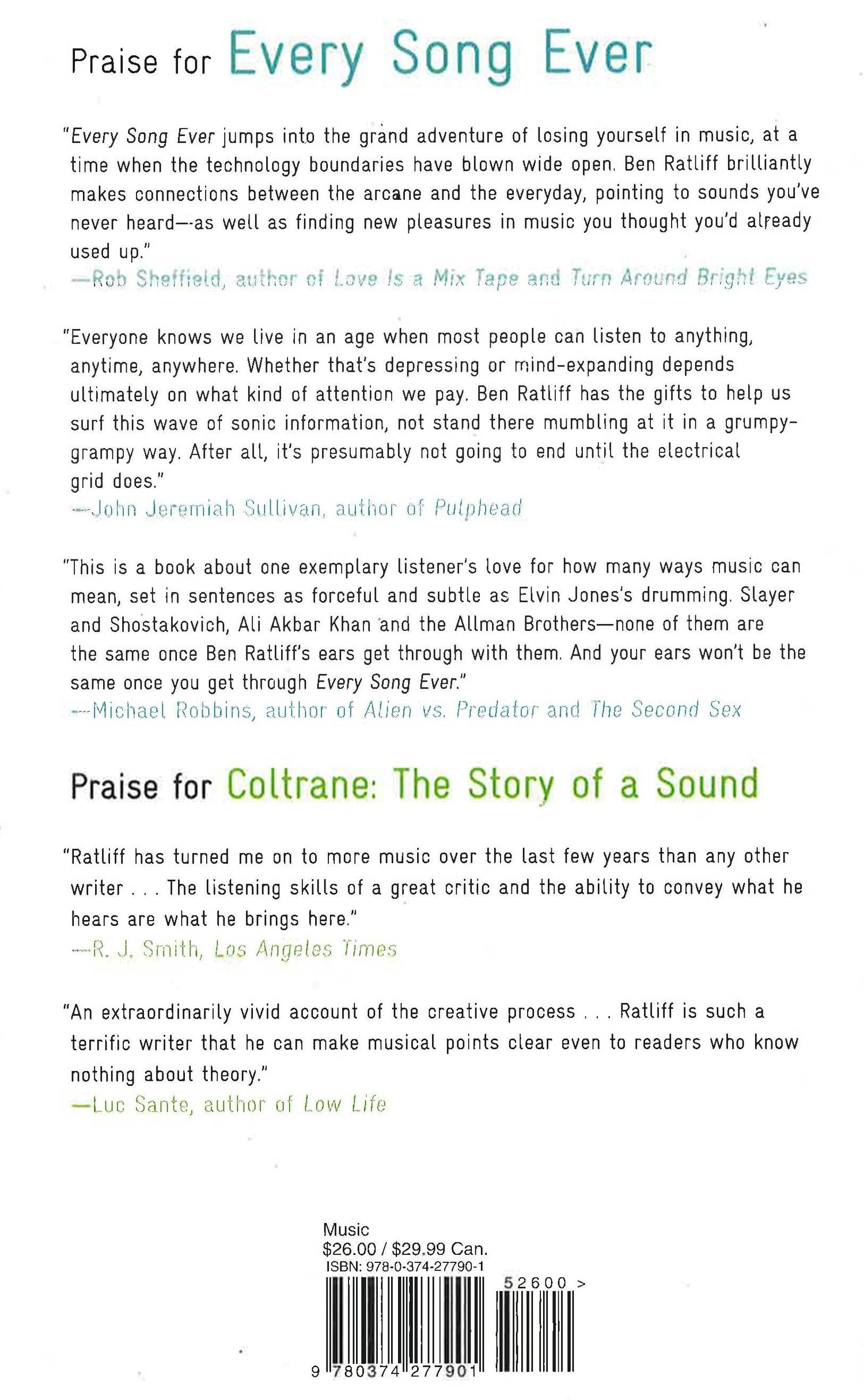 In Every Song Ever, the veteran New York Times music critic Ben Ratliff reimagines the very idea of music appreciation for our times. As familiar subdivisions like "rock" and "jazz" matter less and less and music's accessible past becomes longer and broader, listeners can put aside the intentions of composers and musicians and engage music afresh, on their own terms. Ratliff isolates signal musical traits--such as repetition, speed, and virtuosity--and traces them across wildly diverse recordings to reveal unexpected connections. When we listen for slowness, for instance, we may detect surprising affinities between the drone metal of Sunn O))), the mixtape manipulations of DJ Screw, Sarah Vaughan singing "Lover Man," and the final works of Shostakovich. And if we listen for closeness, we might notice how the tight harmonies of bluegrass vocals illuminate the virtuosic synchrony of John Coltrane's quartet. Ratliff also goes in search of "the perfect moment"; considers what it means to hear emotion by sampling the complex sadness that powers the music of Nick Drake and Slayer; and examines the meaning of certain common behaviors, such as the impulse to document and possess the entire performance history of the Grateful Dead.