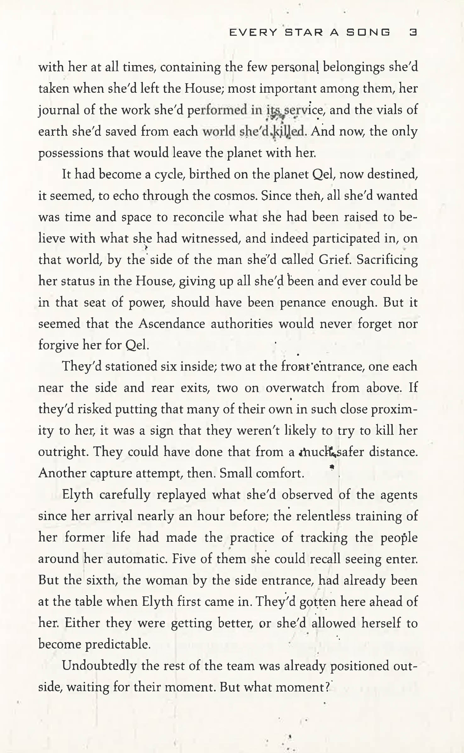 Elyth—a former agent of the religious arm of the Ascendance, The First House—is on the run after the events of Every Sky a Grave, when she and the fugitive Varen Fedic exposed the darker side of Ascendance hegemony on a planet called Qel. Though she just wishes to put the past (and Varen) behind her, she is soon tracked and cornered by the Ascendance agents. Surprisingly, they aren’t there for punishment. Instead, they offer her a deal in exchange for her help in exploring a new planet that seems to have appeared out of nowhere. If she agrees, her sins against the Ascendance and the First House will be forgiven.