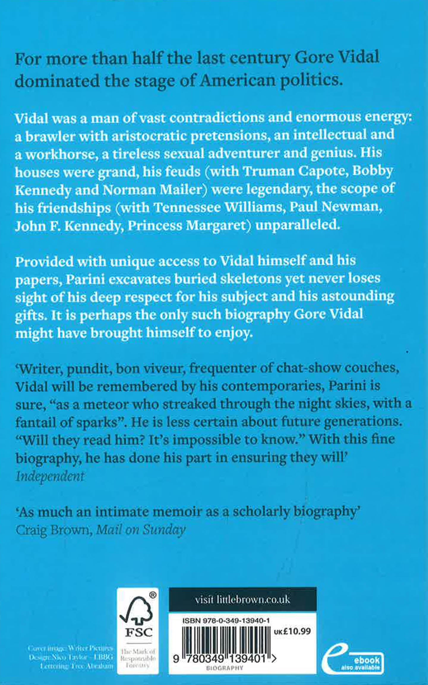 An intimate yet frank biography of Gore Vidal, one of the most accomplished, visible and controversial American novelists and cultural figures of the past century. The product of thirty years of friendship and conversation, Jay Parini's biography probes behind the glittering surface of Vidal's colourful life to reveal the complex emotional and sexual truth underlying his celebrity-strewn life. But there is plenty of glittering surface as well - a virtual Who's Who of the American Century, from Eleanor Roosevelt on down.The life of Gore Vidal was an amazingly full one; a life of colourful incident, famous people and lasting achievements that calls out for careful evocation and examination. Through Jay Parini's eyes and words comes an accessible, entertaining story that puts the life and times of one of the great American figures of the post-war era into context, that introduces the author to a generation who didn't know him before and looks behind-the-scenes at the man and his work in frank ways never possible before his death. Parini, provided with unique access to Vidal's life and his papers, excavates buried skeletons, but never loses sight of his deep respect for Vidal and his astounding gifts.