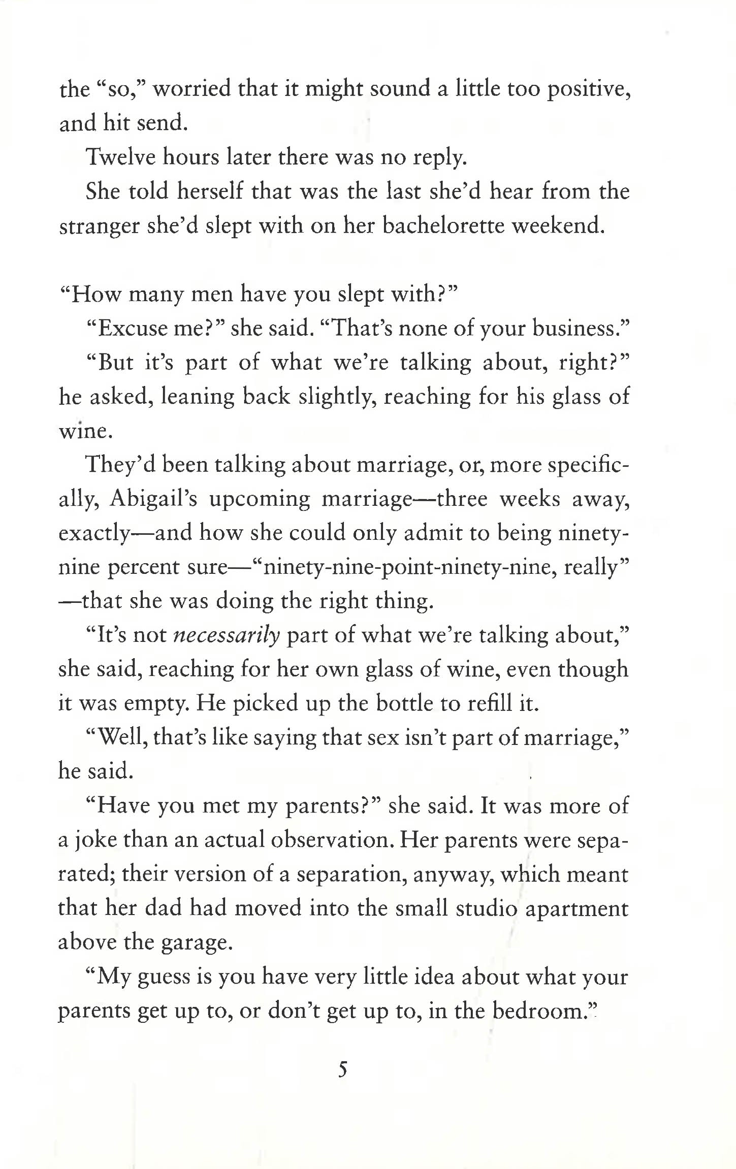For their honeymoon, he whisks her away to an exclusive retreat at a friend's resort off the Maine coast on Heart Pond Island. But once there, Abigail's perfect new life threatens to crash down around her as she recognises one of their fellow guests as the good looking, charismatic stranger who weeks earlier had seduced her at her own Bachelorette party...