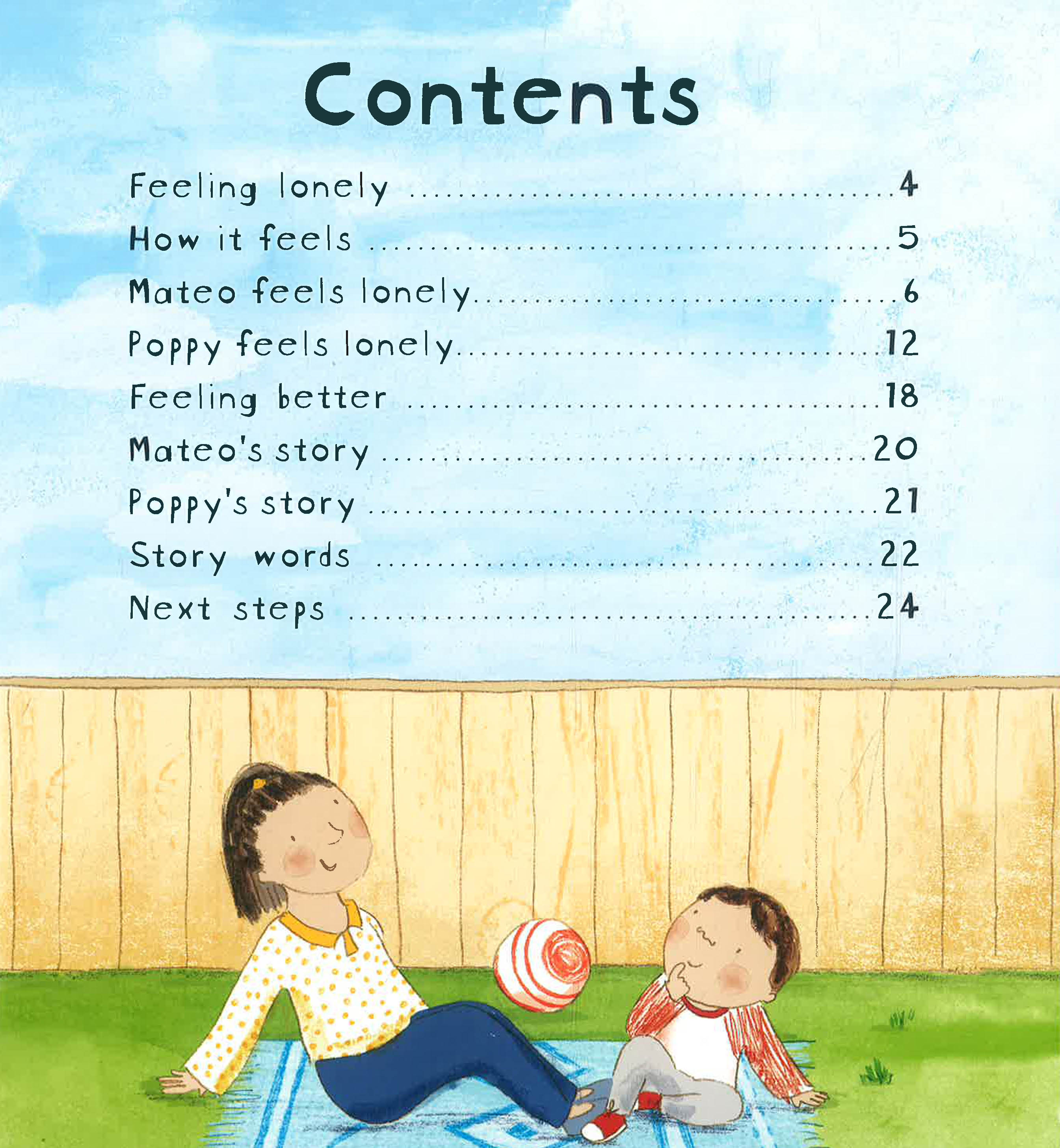 This book focuses on loneliness and all the feelings that this common emotion stirs up. The two stories, told from a child's point of view, help children identify and understand their feelings through everyday scenarios. Through questions for the reader, and advice, this books helps guide them and gently teaches them how to manage or overcome loneliness. With fun, engaging illustrations the book reassures young readers, providing them with vocabulary to express and understand their feelings as they grow up and encounter different situations. Supporting text for parents and teachers ensure children get the most from the books.