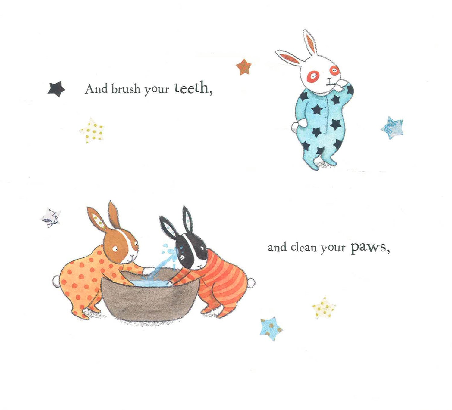It’s time for the bunnies to brush their teeth, clean their paws, and comb their tail. And before they fall asleep, they’ll have time to curl up for one last hug, and one last story shared with some unexpected friends. Everybunny is welcome to join in this bright and cheery bedtime tale before dozing off into sweet dreams.