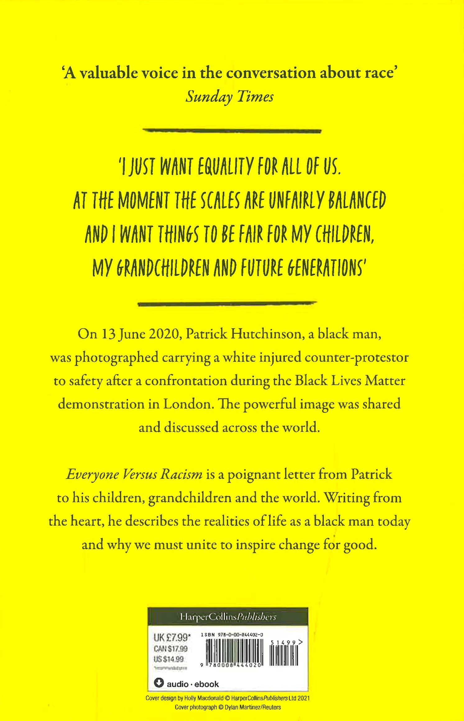 'The best of England' The New Statesman 'A powerful open letter about racism' The Sun 'I just want equality, equality for all of us. At the moment, the scales are unfairly balanced and I just want things to be fair for my children, my grandchildren and future generations.' On 13 June 2020, Patrick Hutchinson, a black man, was photographed carrying a white injured man to safety during a confrontation in London between Black Lives Matter demonstrators and counter-protestors. The powerful image was shared and discussed all around the world. Everyone versus Racism is a poignant letter from Patrick to his children and grandchildren. Writing from the heart, he describes the realities of life as a black man today and why we must unite to inspire change for generations to come.
