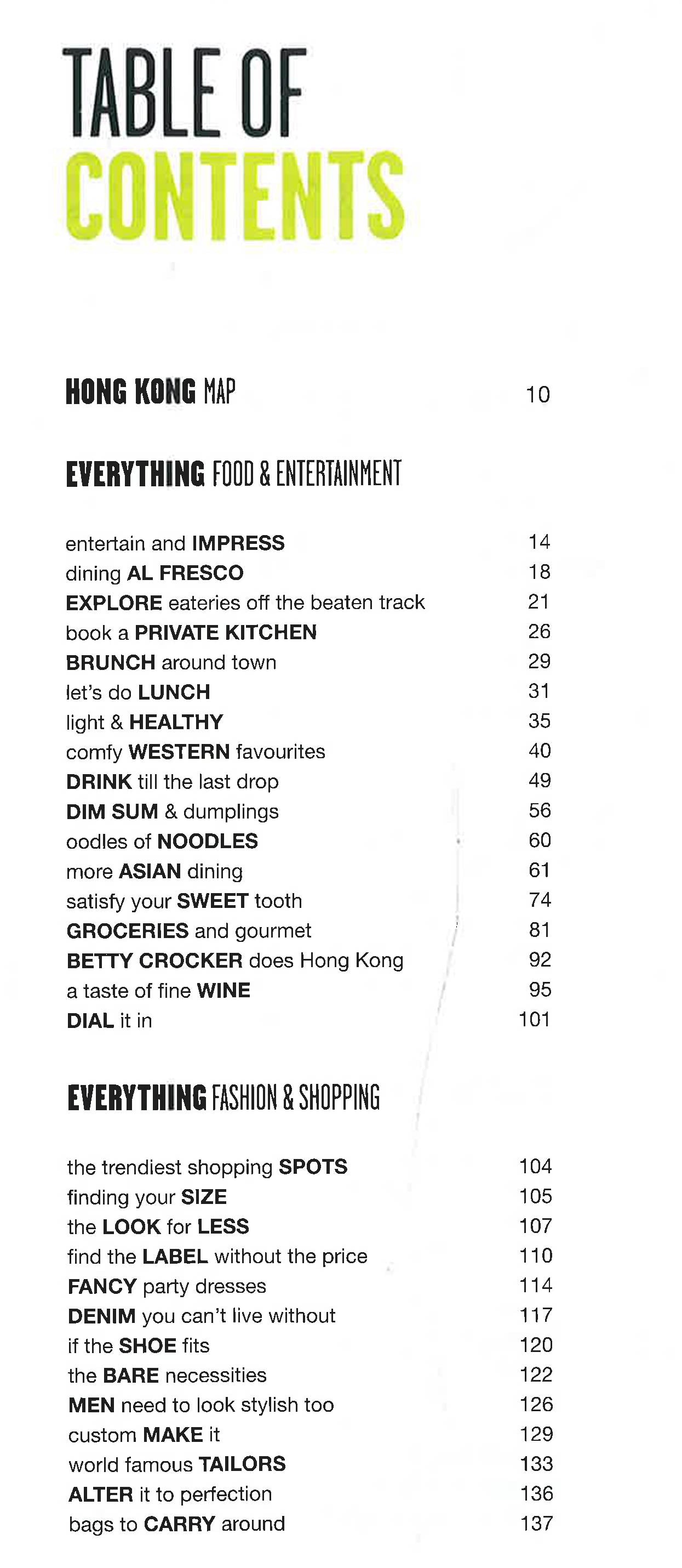 A valuable resource guide to a wonderful shopping destination: Hong Kong. This book explains where to FIND, EAT, BUY, TAILOR, MAKE, FIX, LEARN, SERVICE, PLAY, HEAL, or PRIMP just about anything. Tried-and-tested listings are organized into four ultra-useful categories: 'Everything Food & Entertainment' for restaurant recommendations and more; 'Everything House & Home' for finding antiques and accessories; 'Everything Fashion & Shopping' for finding the latest styles or tailoring clothes; and 'Everything Lifestyle & Well-Being' for all things recreational and educational.