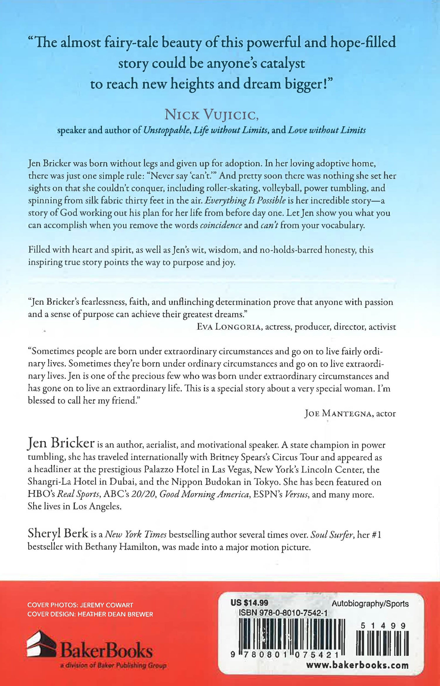 Everything Is Possible is her incredible story--a story of God working out his plan for her life from before day one. Readers follow Jen from the challenges of growing up different to holding captive audiences numbering in the tens of thousands. Everything Is Possible shows readers what theycan accomplish when they remove the words coincidence and limitation from their vocabulary. Filled with heart and spirit, as well as Jen's wit, wisdom, and no-holds-barred honesty, this inspiring true story points the way to purpose and joy. Foreword by Nick Vujicic.