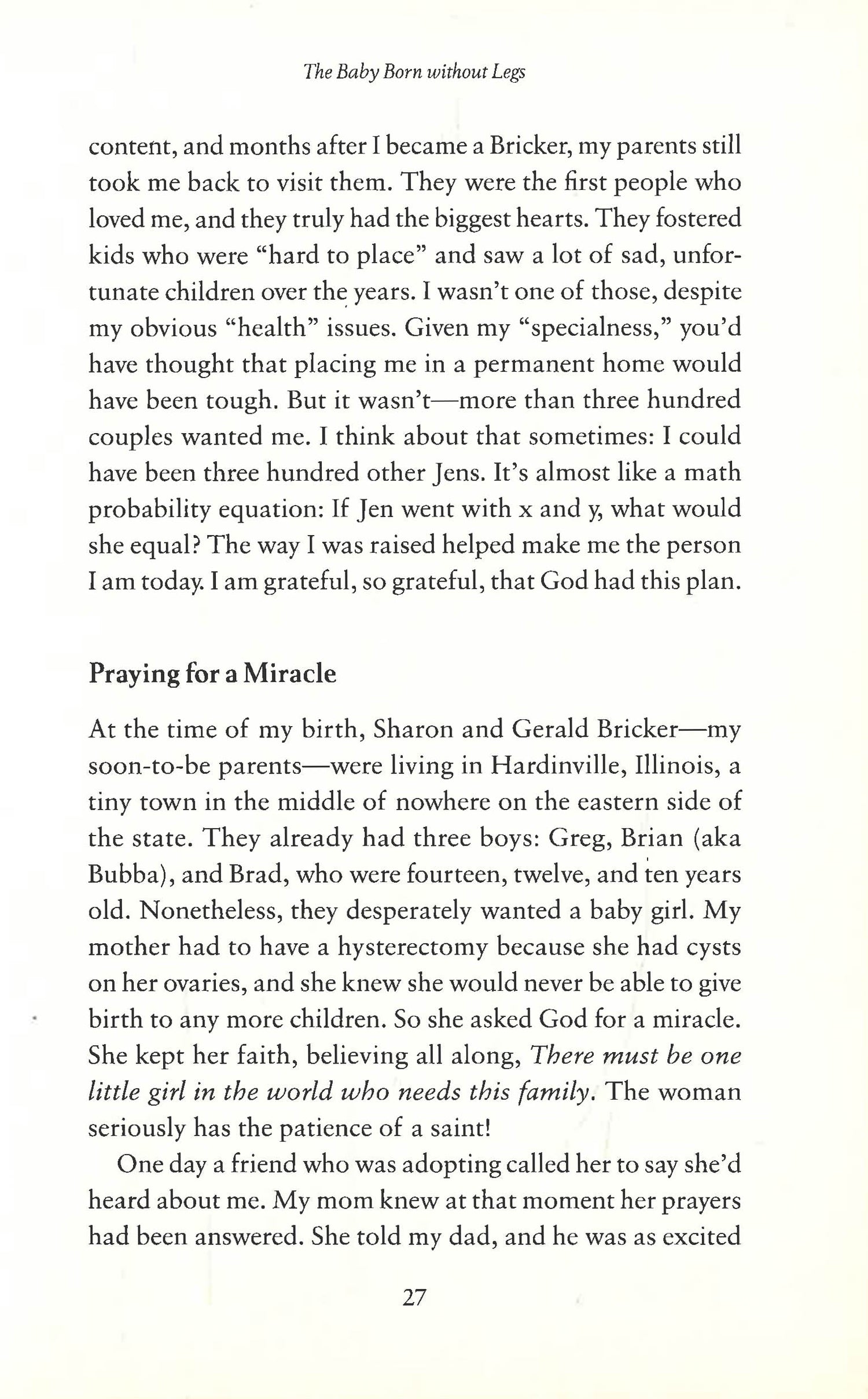 Jen Bricker was born without legs. Shocked and uncertain they could care for her, her biological parents gave her up for adoption. In her loving adoptive home, there was just one simple rule: "Never say 'can't.'" And pretty soon, there was nothing this small but mighty powerhouse set her sights on that she couldn't conquer: roller-skating, volleyball, power tumbling, and spinning from silk ribbons thirty feet in the air.