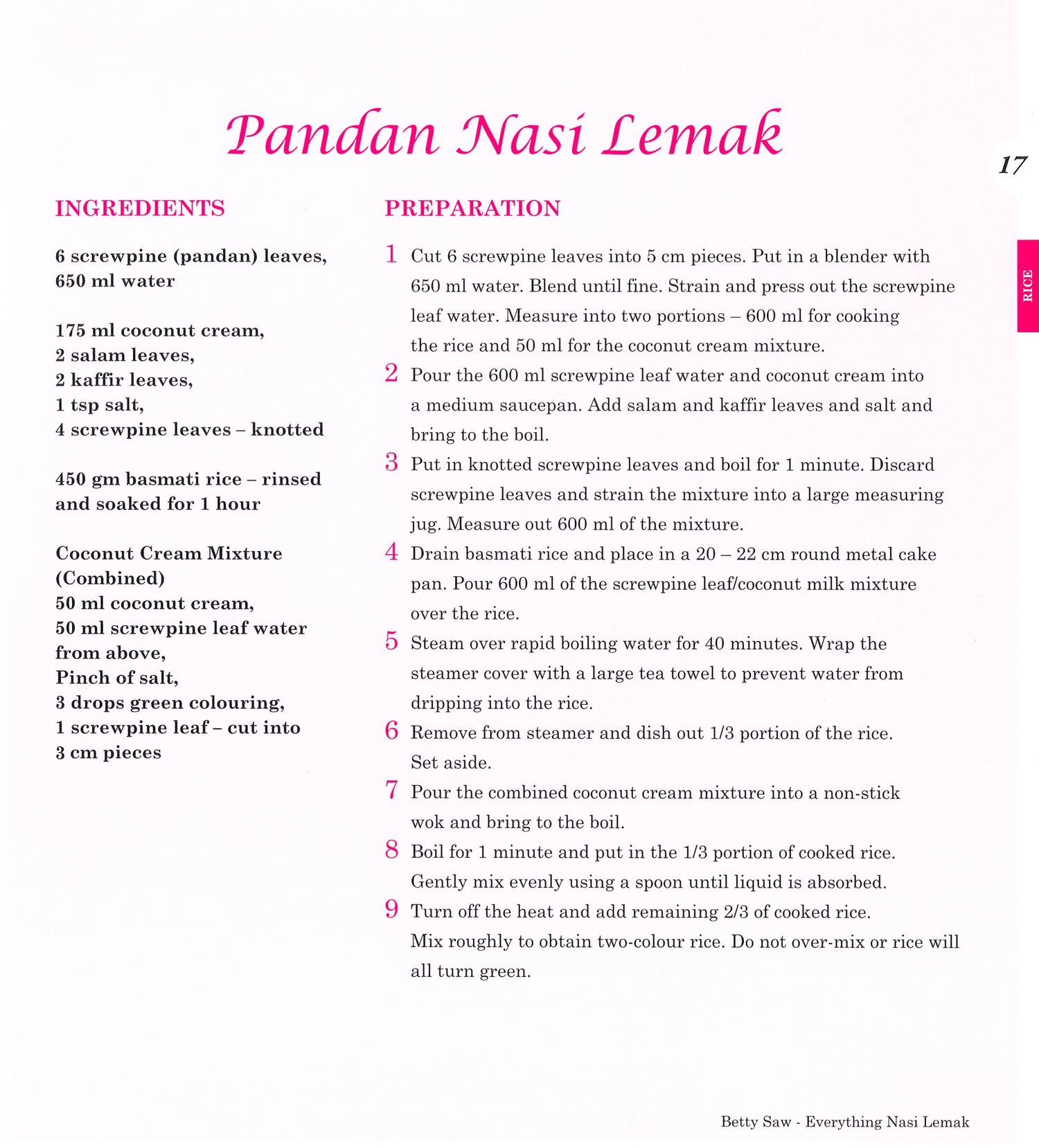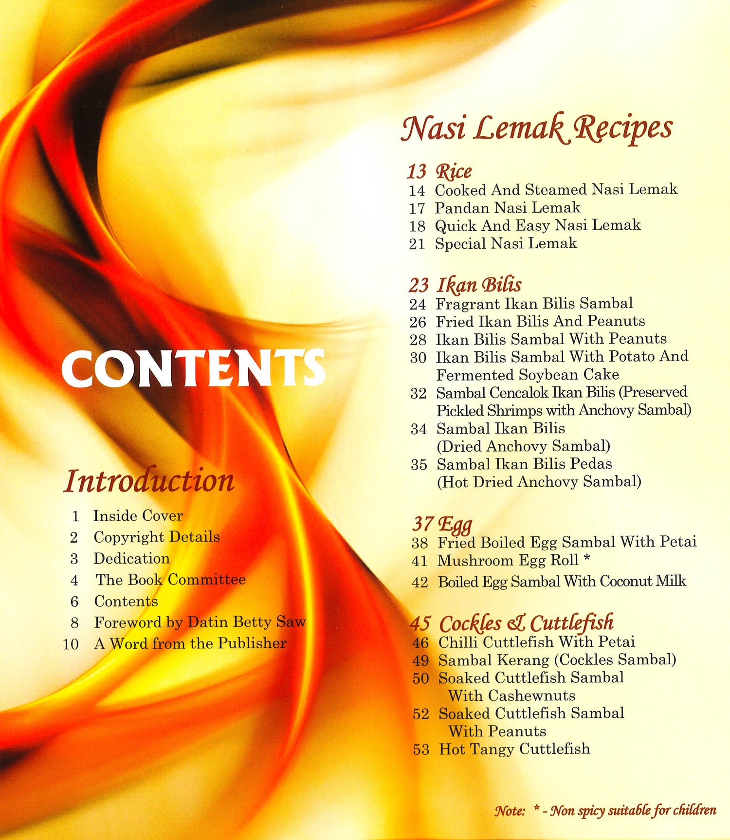 Readers can try their hand at making Pandan Nasi Lemak, Sambal Cencalok Ikan Bilis, Potted Fish Otak-otak, Nyonya Beef Rendang, Belacan Chicken Wings, Mushroom Egg Roll, Grilled Chicken Wings, Ayam Pandan, Rendang Ayam Cili Padi, Nyonya Acar, Udang Masak Serai, Botok Udang Ayam and many other delectable dishes.