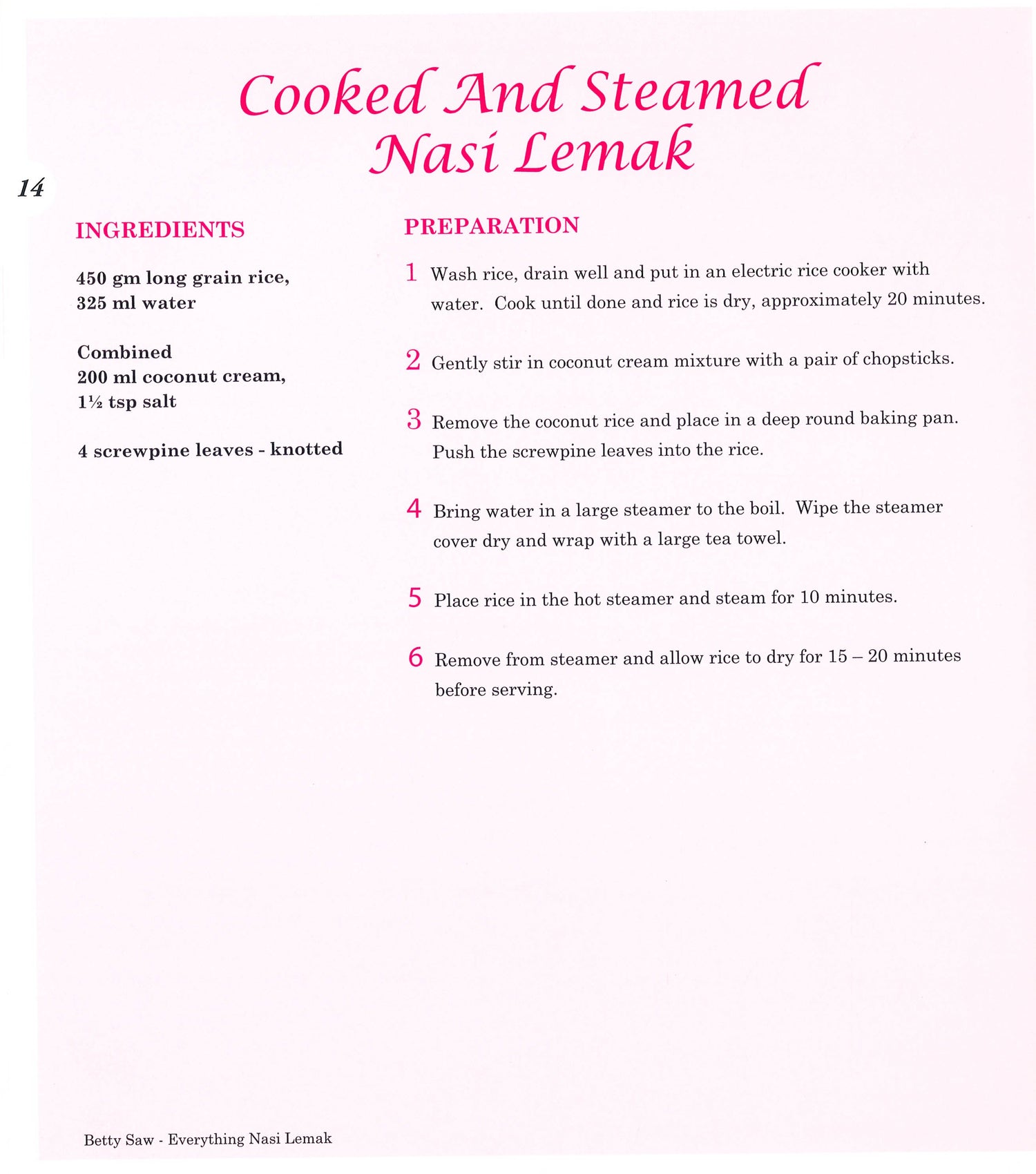 Everything Nasi Lemak is a delicious kitchen-tested recipe book with more than 74 tempting recipes, including various meat, vegetable and seafood dishes, to go along with its star attraction, nasi lemak.