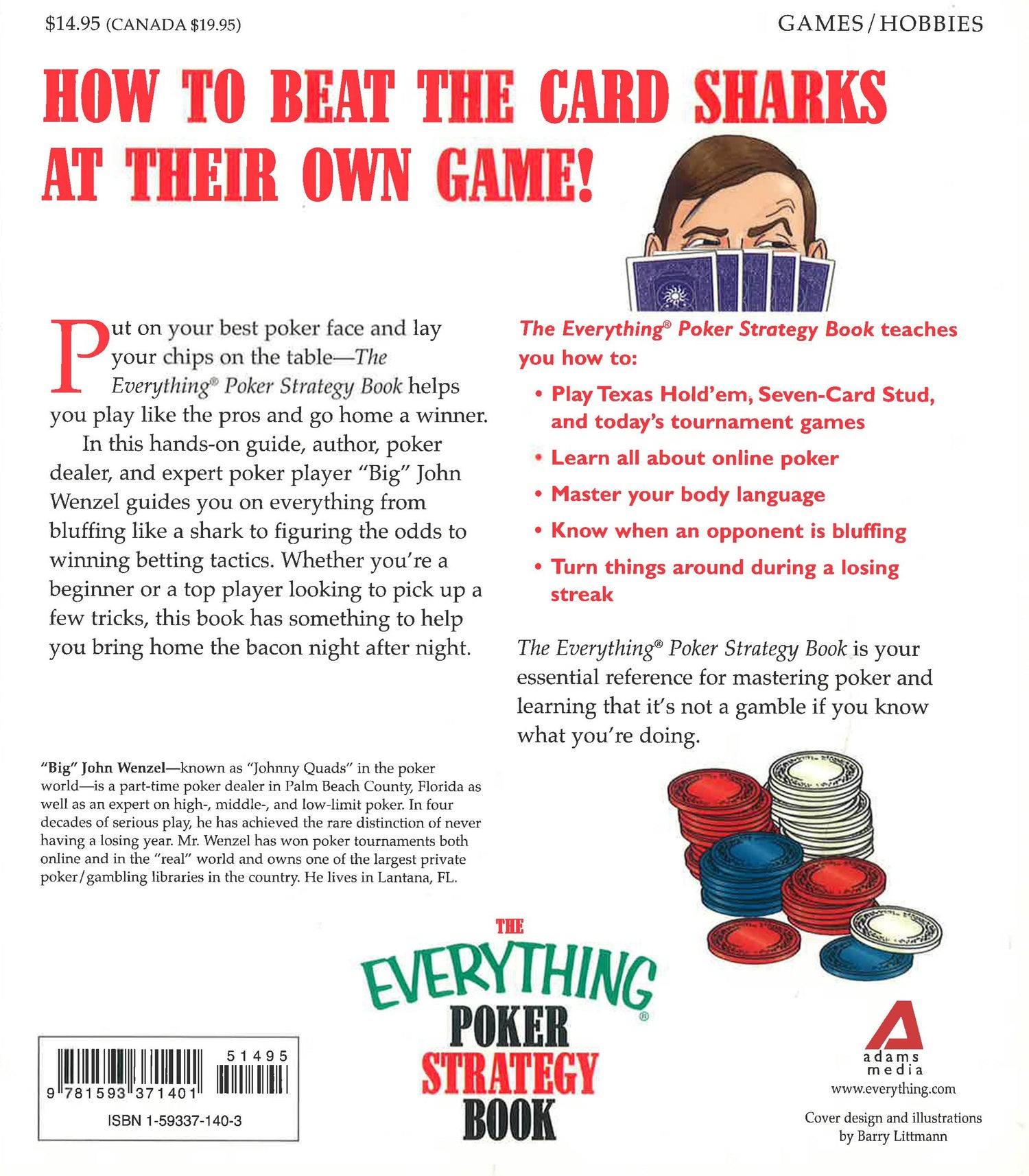 Put on your best poker face and lay your chips on the table - "The Everything Poker Strategy Book" helps you gain the skills you need to improve your game and go home with some extra winnings in your pocket. In this hands-on guide, author, poker dealer, and expert poker player "Big" John Wenzel guides you on everything from bluffing like a pro to measuring the odds to placing bets. Whether you're a beginner or an expert looking to pick up a few tricks, this book has something to help you win some big pots. "The Everything Poker Strategy Book" teaches you how to: play Omaha, Hold'em, Stud, and other great poker games; learn all about online poker; master your body language; know when to raise the stakes; and, turn things around after losing a few hands in a row.