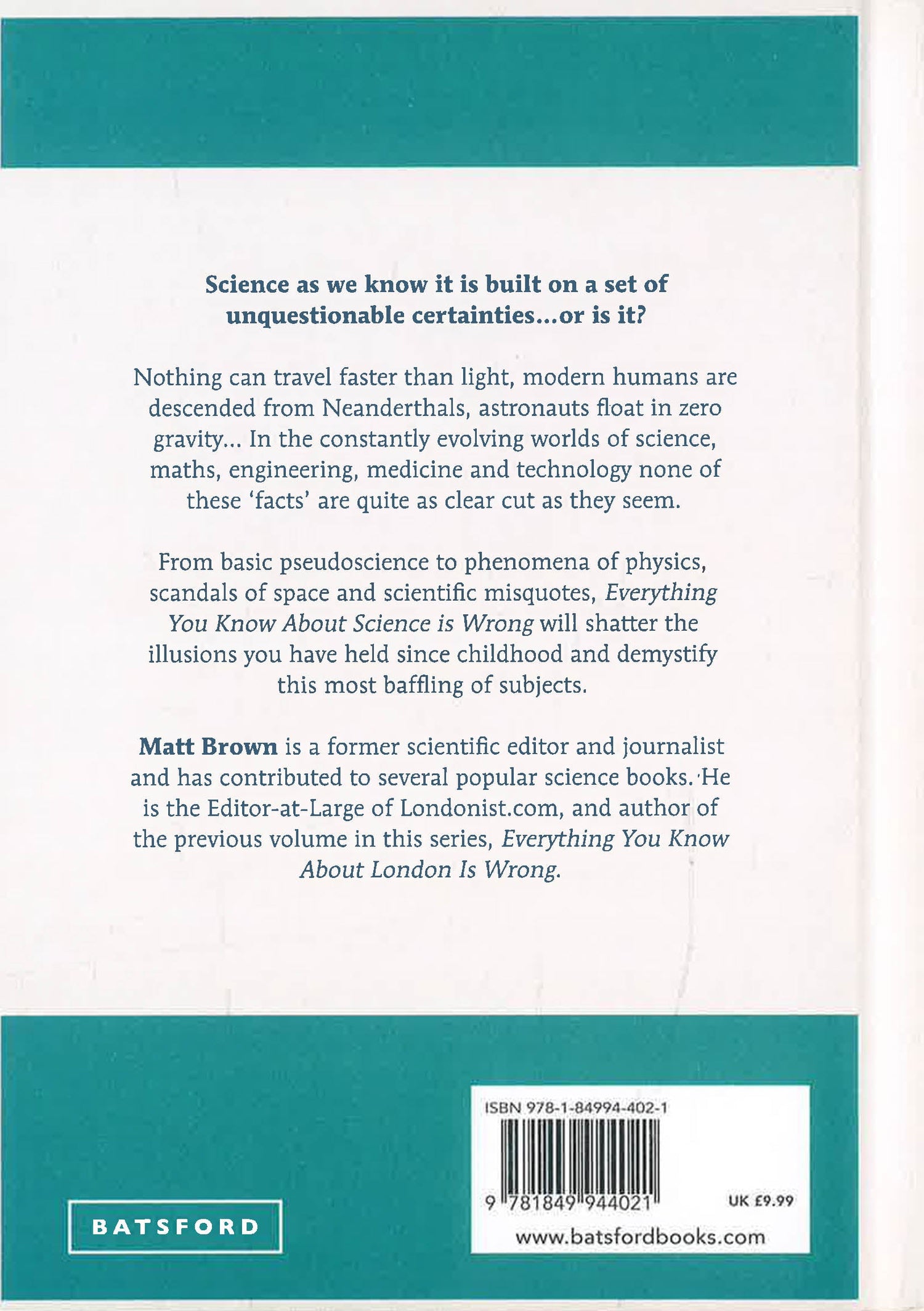 Hot on the heels of the fascinating compendium Everything You Know About London Is Wrong, this next book in the series, written by author Matt Brown in his trademark humourous style, debunks the scientific myths we all take for granted. Does nothing travel faster than the speed of light? Well, in certain circumstances, a winded tortoise can go faster. Are there actually seven colours in a rainbow? Think again. And our author merrily explains why our hair and nails don't keep growing after we die and why chemicals in our diet might not be the toxic threats we are led to believe.
