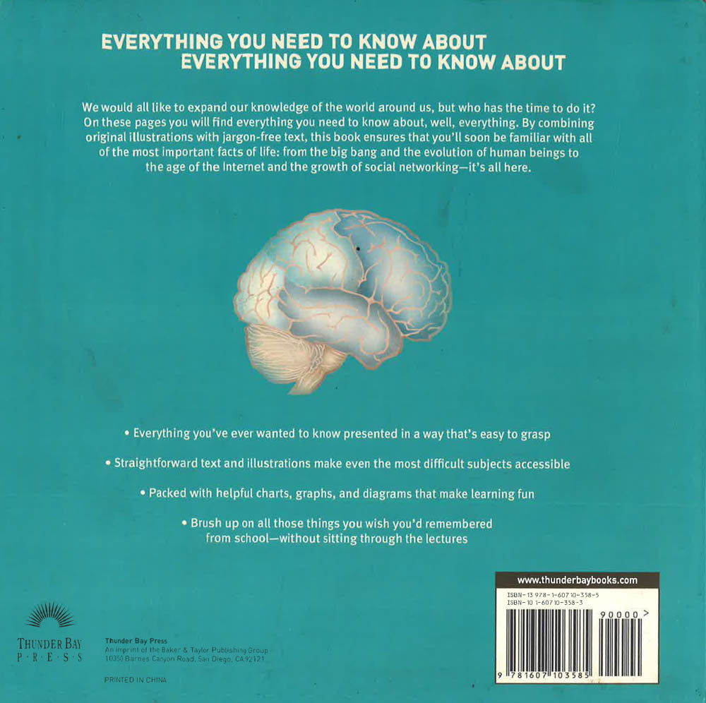 Which continent is the largest? What is the composition of the air we breathe? What are the seven natural wonders of the world? You may have once learned the answers to these questions in school, but for most of us those early lessons have faded and been replaced by the minutiae of our daily lives. Yet it can often be helpful to have these facts at your fingertipsand with "Everything You Need to Know About Everything," now you can! Organized into 8 sectionsTime & Space, Our World, The Living Earth, Humans, Environment & Society, Making History, Science & Medicine, and Technology & Communicationsthis fascinating reference is the perfect guide to every aspect of our existence. From the structure of the earth to the structure of our brains, from the big bang to social networking, you ll gain enough knowledge to satisfy every curiosity. With maps, charts, and illustrations in full color, "Everything You Need to Know About Everything" makes it easy to see the world from a newand wiser!perspective.