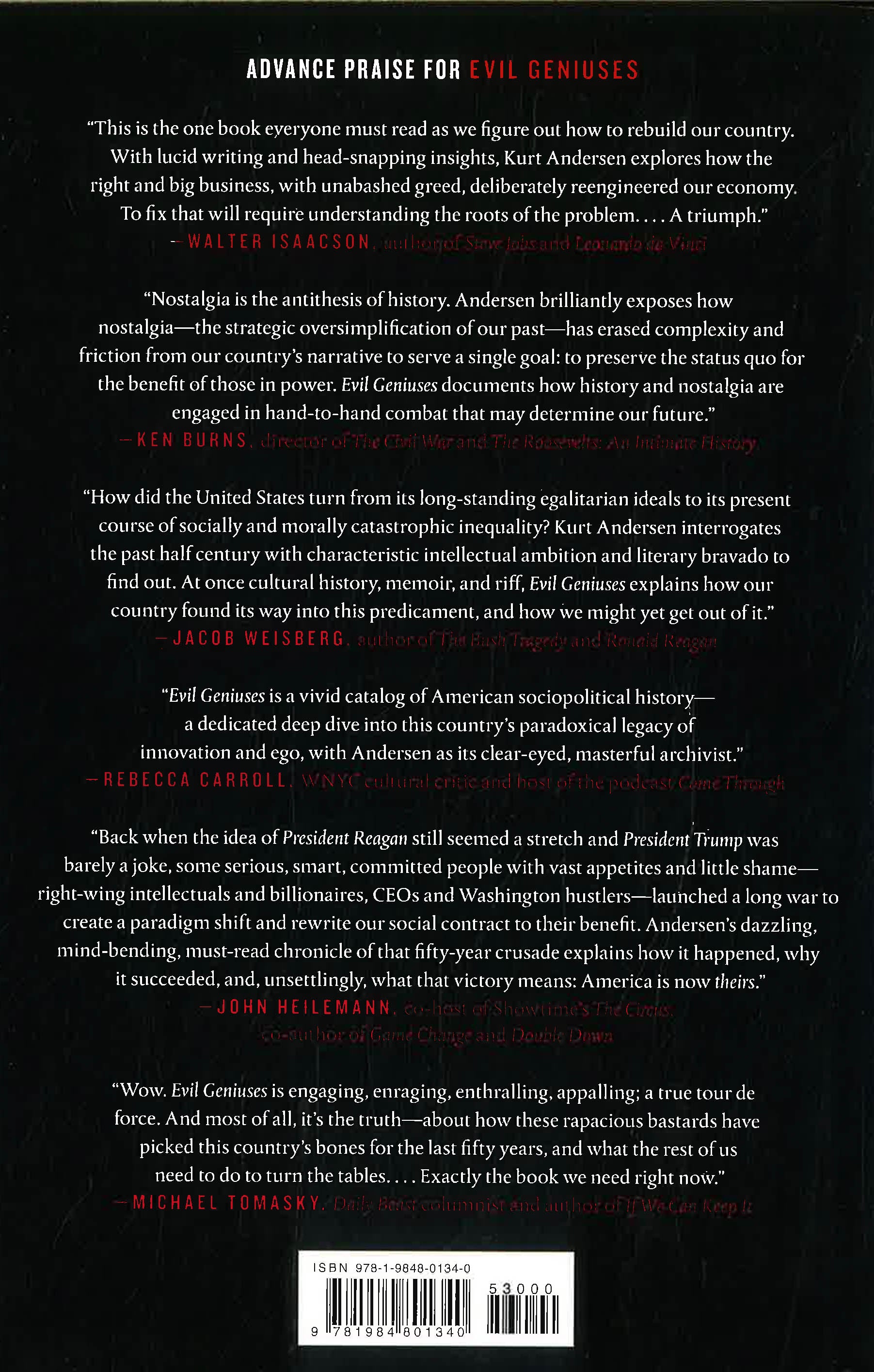 Why and how did America take such a wrong turn? In this deeply researched and brilliantly woven cultural, economic, and political chronicle, Kurt Andersen offers a fresh, provocative, and eye-opening history of America’s undoing, naming names, showing receipts, and unsparingly assigning blame—to the radical right in economics and the law, the high priests of high finance, a complacent and complicit Establishment, and liberal “useful idiots,” among whom he includes himself.