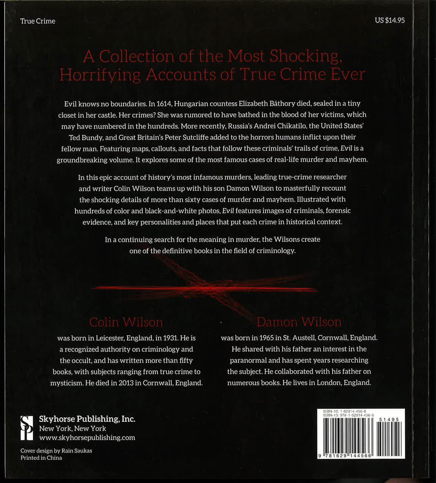A collection of the most shocking, horrifying accounts of true crime ever. Evil knows no boundaries. In 1614, Hungarian countess Elizabeth Bathory died, sealed in a tiny closet in her castle. Her crimes? She was rumored to have bathed in the blood of her victims, which may have numbered in the hundreds. More recently, Russia's Andrei Chikatilo, the United States' Ted Bundy, and Great Britain's Peter Sutcliffe added to the horrors humans inflict upon their fellow man. Featuring maps, callouts, and facts that follow these criminals' trails of crime, Evil is a groundbreaking volume. It explores some of the most famous crime cases of real-life murder and mayhem. In this epic account of history's most infamous murder cases, leading true-crime researcher and writer Colin Wilson teams up with his son Damon Wilson to masterfully recount the shocking details of more than sixty cases of murder and mayhem. Illustrated with hundreds of color and black-and-white photos, Evil features images of criminals, forensic evidence, and key personalities and places that put each crime in historical context. In a continuing search for the meaning in murder, the Wilsons create one of the definitive books in the field of criminology.