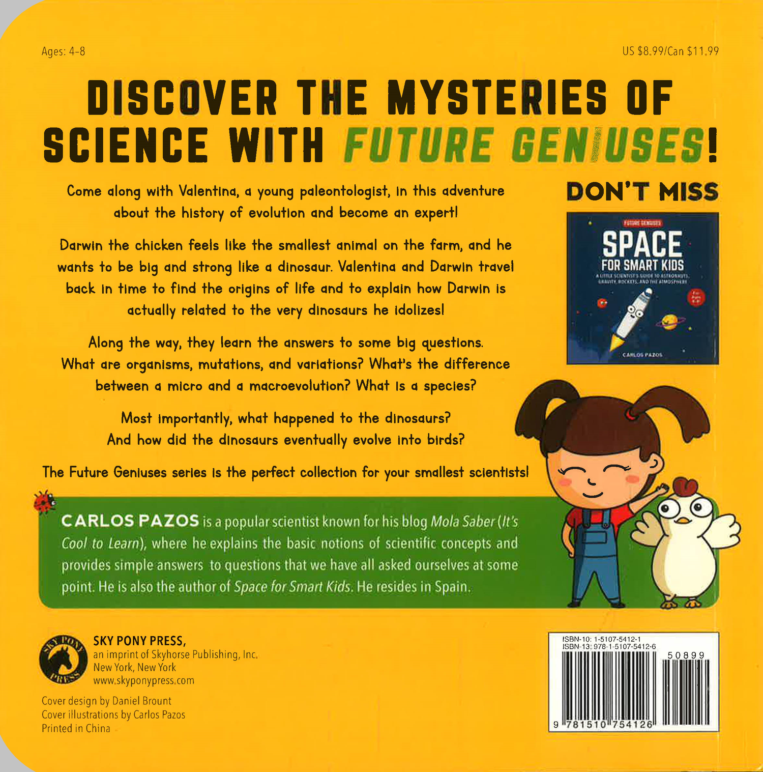 Future Geniuses is a collection that will help families spend a lot of time reading and learning together. Through simple text and fun illustrations, author and scientist Carlos Pazos makes the subjects of evolution, and specifically dinosaurs and their creation and extinction, approachable and easy to understand for even the smallest scientists.