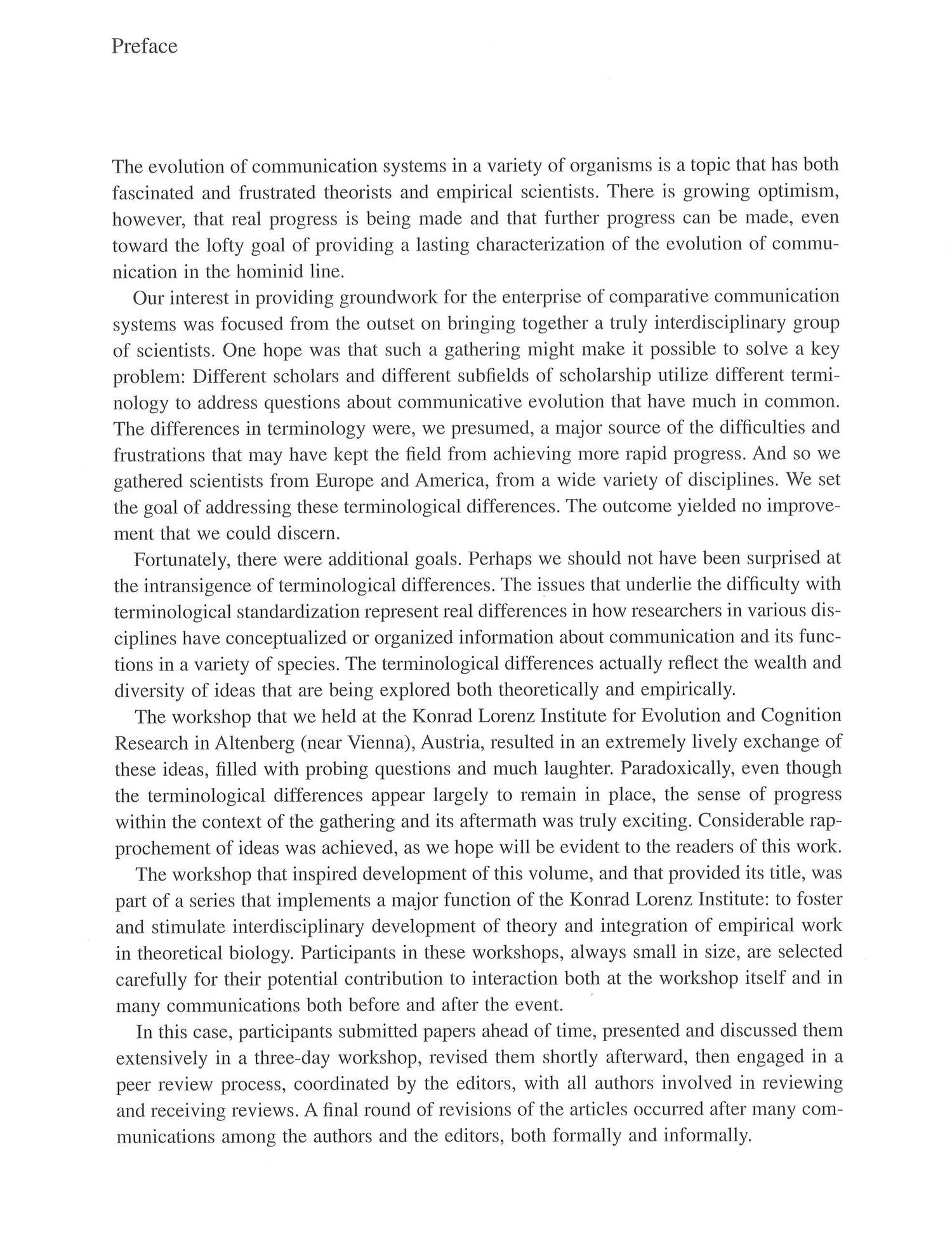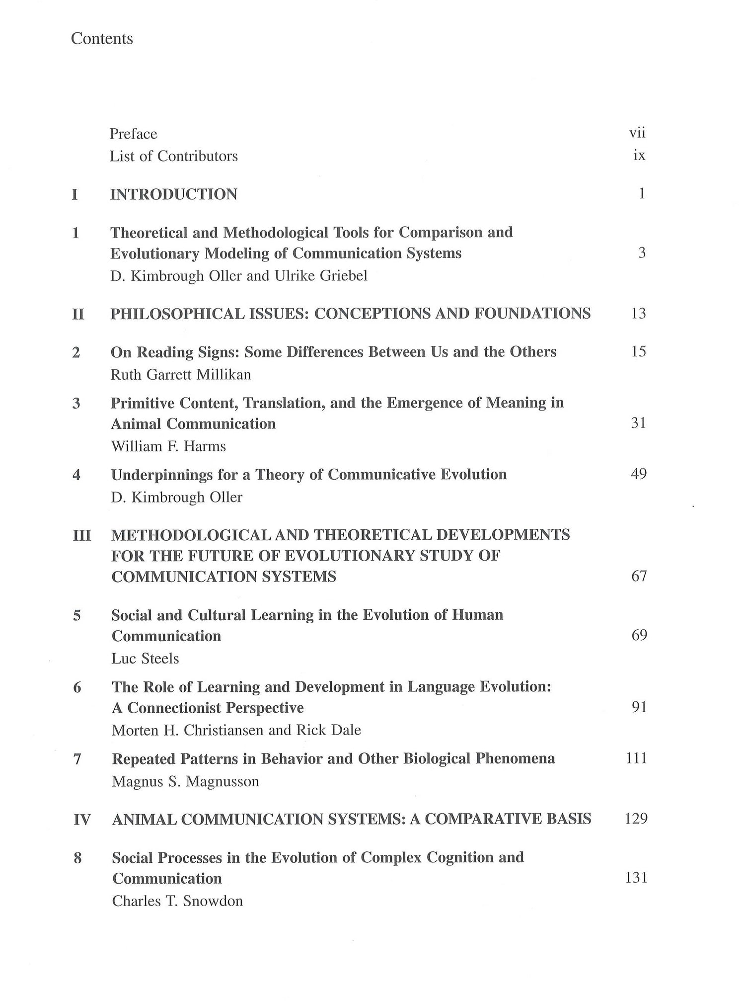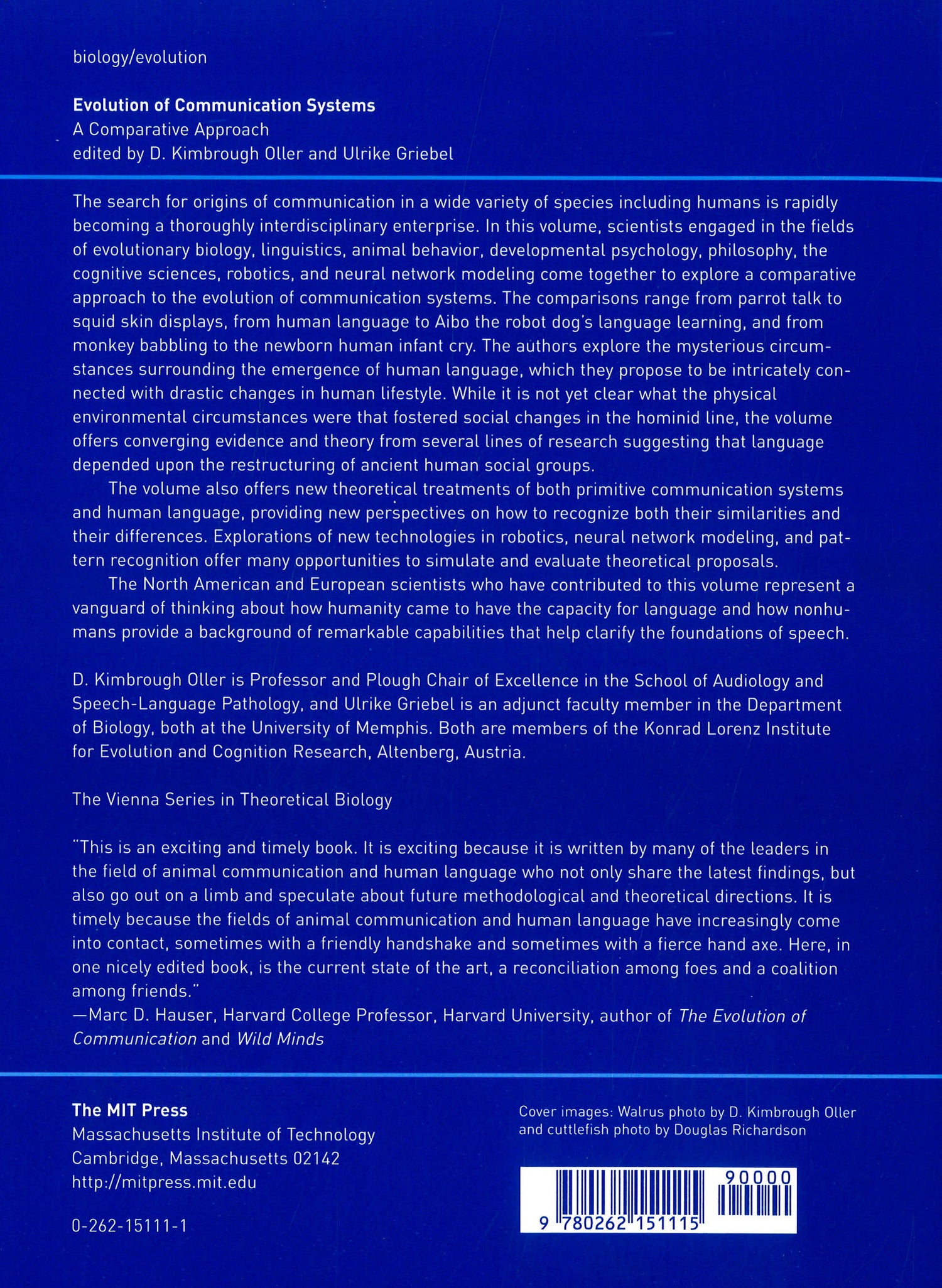 The search for origins of communication in a wide variety of species including humans is rapidly becoming a thoroughly interdisciplinary enterprise. In this volume, scientists engaged in the fields of evolutionary biology, linguistics, animal behavior, developmental psychology, philosophy, the cognitive sciences, robotics, and neural network modeling come together to explore a comparative approach to the evolution of communication systems. The comparisons range from parrot talk to squid skin displays, from human language to Aibo the robot dog's language learning, and from monkey babbling to the newborn human infant cry. The authors explore the mysterious circumstances surrounding the emergence of human language, which they propose to be intricately connected with drastic changes in human lifestyle. While it is not yet clear what the physical environmental circumstances were that fostered social changes in the hominid line, the volume offers converging evidence and theory from several lines of research suggesting that language depended upon the restructuring of ancient human social groups. The volume also offers new theoretical treatments of both primitive communication systems and human language, providing new perspectives on how to recognize both their similarities and their differences. Explorations of new technologies in robotics, neural network modeling and pattern recognition offer many opportunities to simulate and evaluate theoretical proposals. The North American and European scientists who have contributed to this volume represent a vanguard of thinking about how humanity came to have the capacity for language and how nonhumans provide a background of remarkable capabilities that help clarify the foundations of speech.