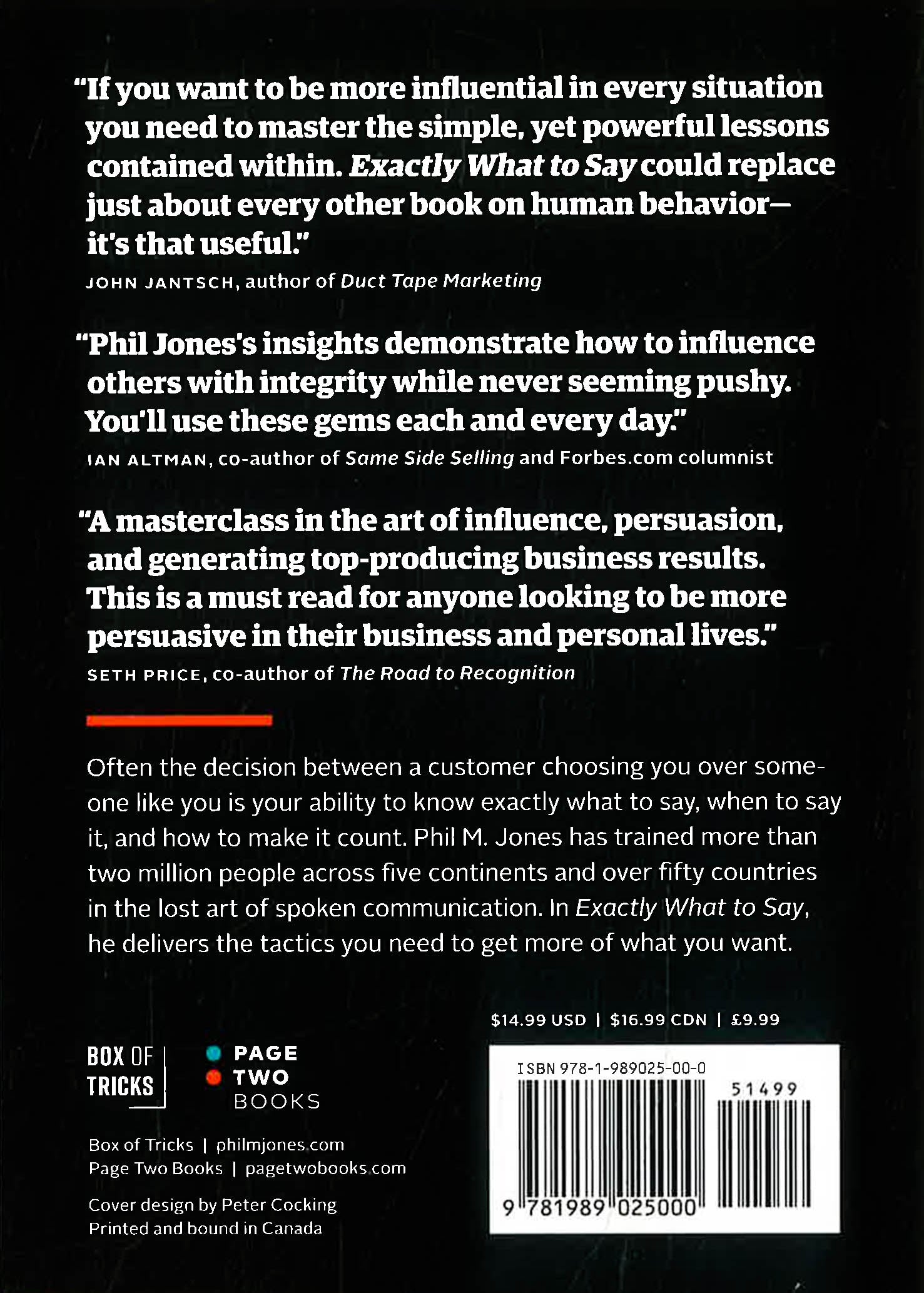 Often the decision between a customer choosing you over someone like you is your ability to know exactly what to say, when to say it, and how to make it count. Phil M. Jones has trained more than two million people across five continents and over fifty countries in the lost art of spoken communication. In Exactly What to Say, he delivers the tactics you need to get more of what you want.