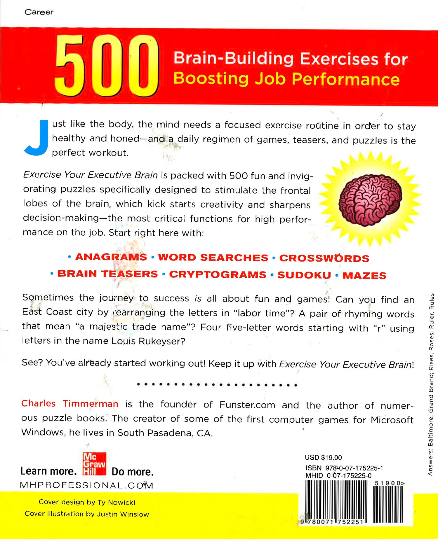 500 brain buliding puzzles designed to improve the parts of the brain executives rely on most, including goal setting, decision making, and creativity 500 Brain-Building Exercises for Boosting Job PerformanceJust like the body, the mind needs a focused exercise routine in order to stay healthy and honed--and a daily regimen of games, teasers, and puzzles is the perfect workout.Exercise Your Executive Brain is packed with 500 fun and invigorating puzzles specifically designed to stimulate the frontal lobes of the brain, which kick starts creativity and sharpens decision-making--the most critical functions for high performance on the job. Start right here with:* Anagrams * Word Searches * Crosswords * Brain Teasers * Cryptograms * Sudoku * MazesSometimes the journey to success is all about fun and games! Can you find an East Coast city by rearranging the letters in "labor time"? A pair of rhyming words that mean "a majestic trade name"? Four five-letter words starting with "r" using letters in the name Louis Rukeyser?See? You've already started working out! Keep it up with Exercise Your Executive Brain!