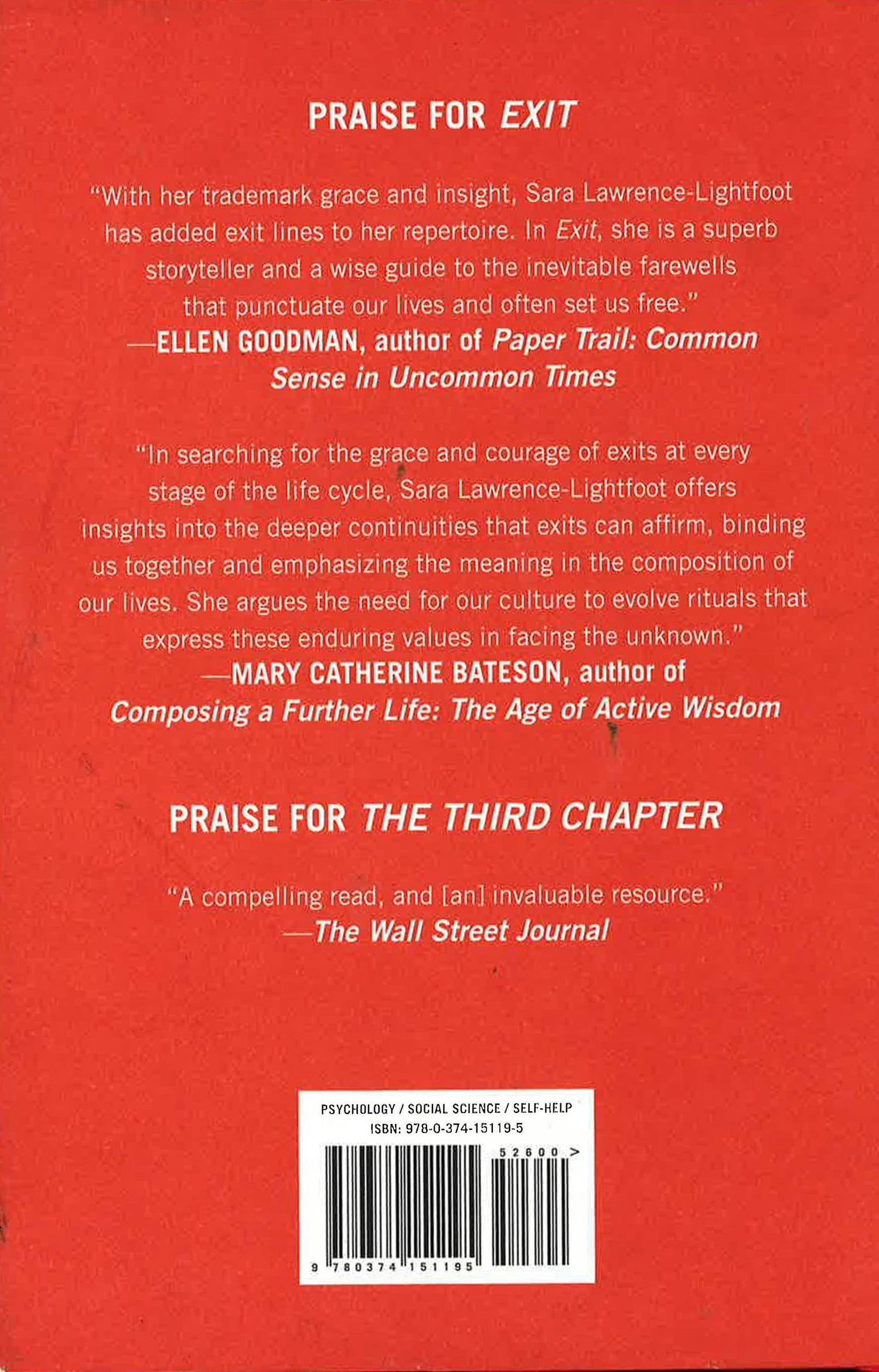 Lawrence-Lightfoot, a sociologist and a professor at the Harvard Graduate School of Education, has interviewed more than a dozen women and men in states of major change, and she paints their portraits with sympathy and insight: a gay man who finds home and wholeness after coming out; a sixteen-year-old boy forced to leave Iran in the midst of the violent civil war; a Catholic priest who leaves the church he has always been devoted to, he life he has loved, and the work that has been deeply fulfilling; an anthropologist who carefully stages her departure from the "field" after four years of research; and many more. Too often, Lawrence-Lightfoot believes, we exalt new beginnings at the expense of learning from our goodbyes. "Exit" finds wisdom and perspective in the possibility of moving on and marks the start of a new conversation, to help us discover how we might make our exits with purpose and dignity.