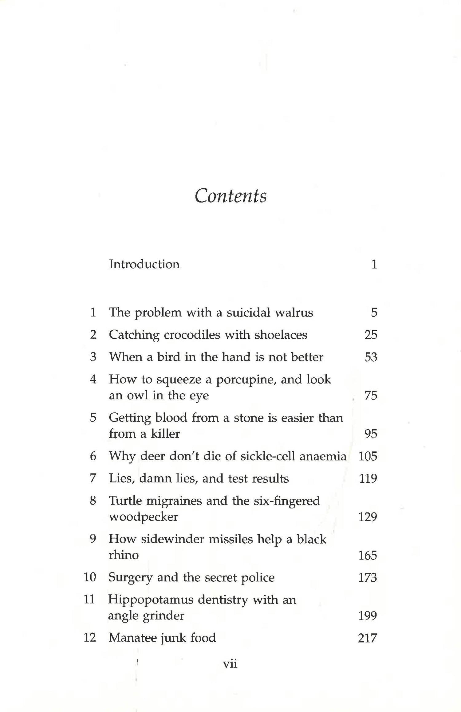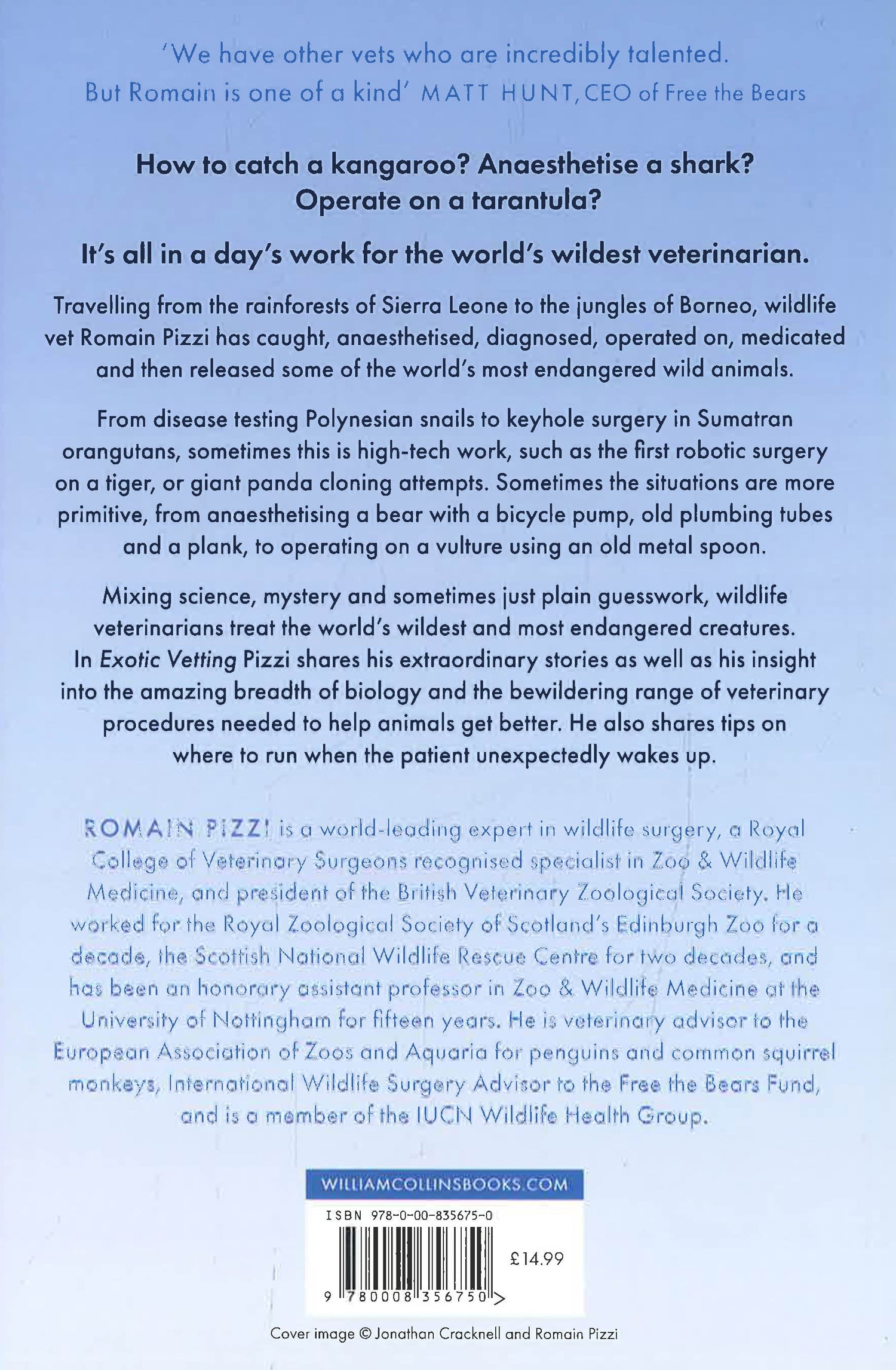 From disease testing Polynesian snails to keyhole surgery in Sumatran orangutans; from endoscopy in sharks to ultrasound on a chimpanzee. Sometimes this is high tech work, such as the first robotic surgery in a tiger, or giant panda cloning attempts. Sometimes the situations are more primitive, from anaesthetising a bear with a bicycle pump, old plumbing tubes and a plank, to operating on a vulture using an old metal spoon.