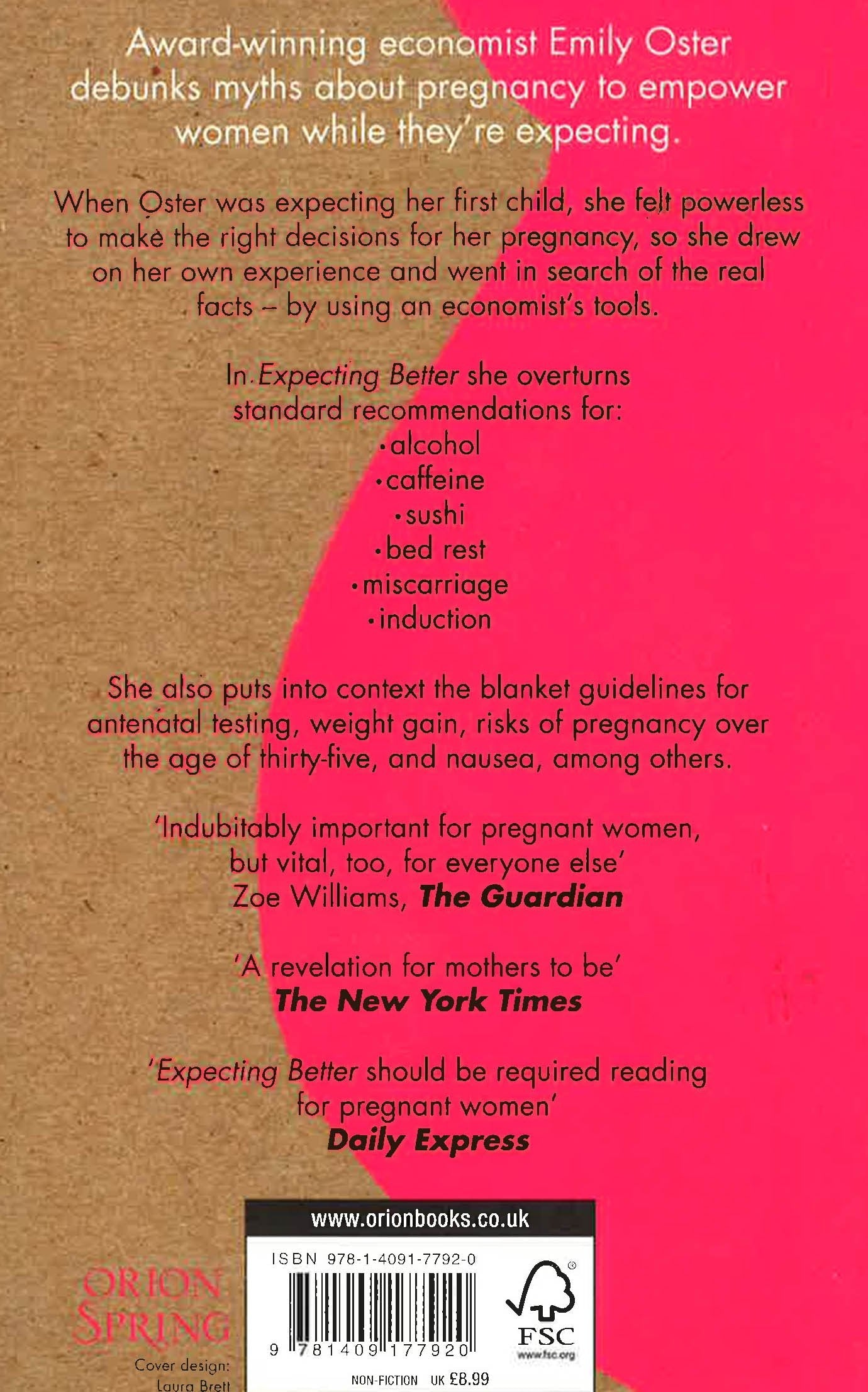 EXPECTING BETTER overturns standard recommendations for alcohol, caffeine, sushi, bed rest and induction, while putting in context the blanket guidelines for fetal testing, weight gain, risks of pregnancy over the age of 35, and nausea, among others.