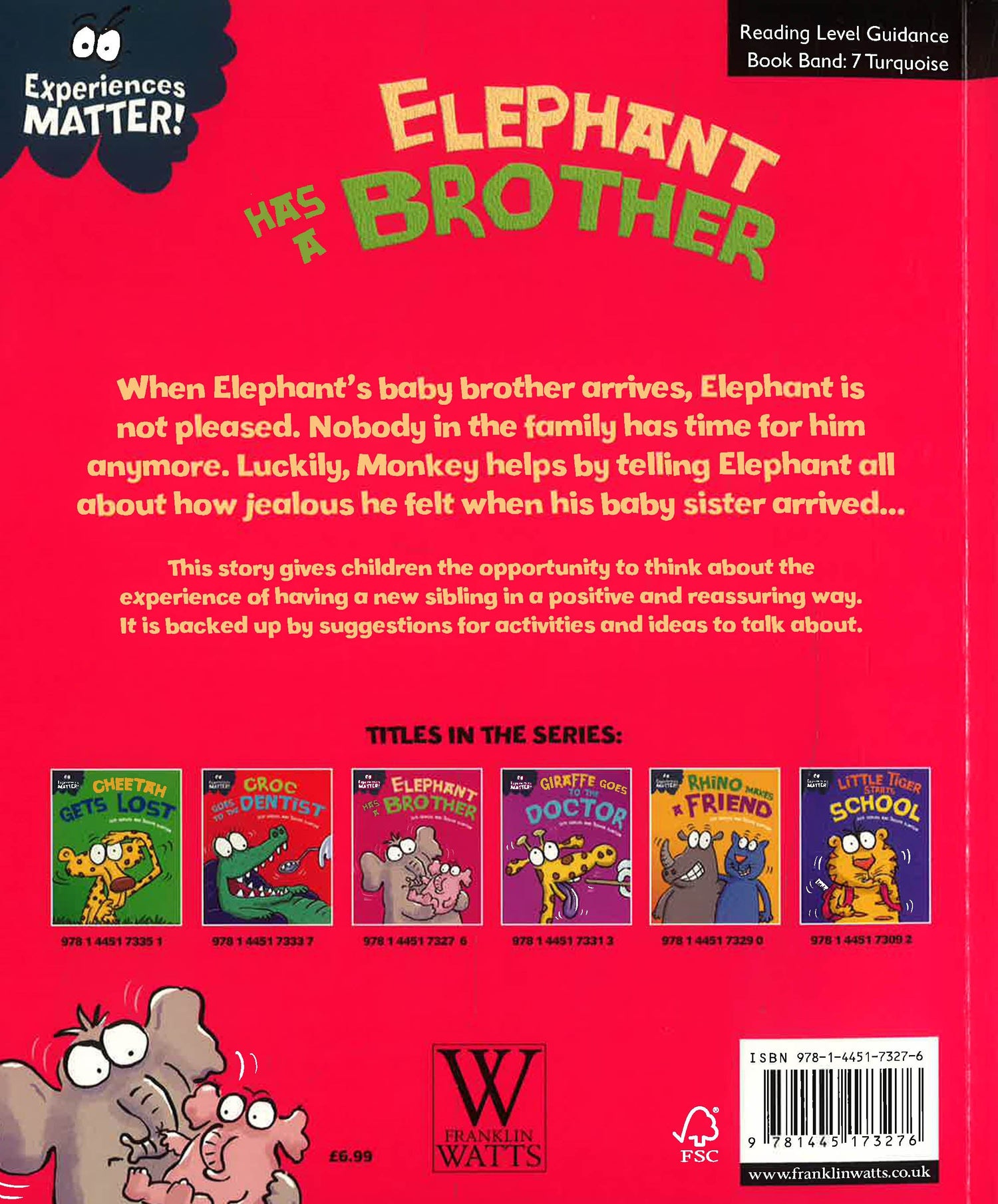 Elephant Has a Brother offers a gentle introduction to the experience of having a new sibling for young children.This funny, charming story is the perfect way to introduce young children to the experience of a new sibling. Also included are suggestions for activities and ideas to talk through together to help children reflect on their own experiences.When Elephant's brother arrives, Elephant is not happy. He has to share everything! And nobody seems to have any time for him any more. Luckily, Monkey is on hand to help him enjoy the new arrival.The Experiences Matter series of picture books provide a gentle means of discussing experiences, boosting self-esteem and reinforcing good behaviour. Supports the Personal, Social and Emotional Development Area of Learning in the Early Years Foundation Stage, and is also suitable for use with children in KS1 and can be used to discuss values. Suitable for children under 5.