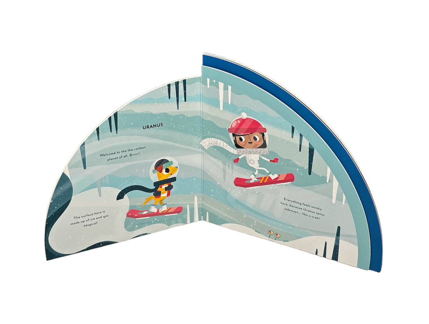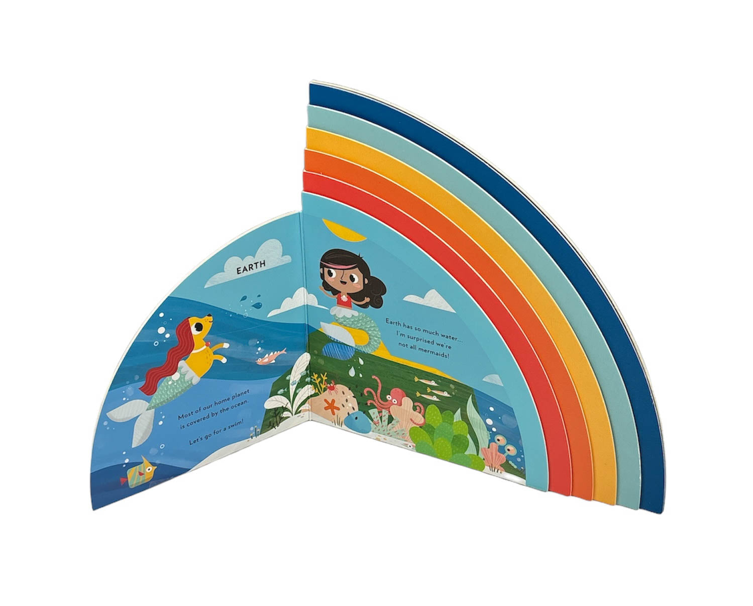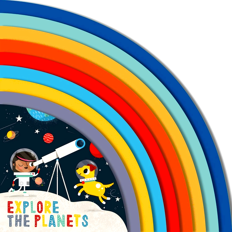 In Explore the Planets, Evie and her pet dog Juno explore the planets of the solar system, telling readers what they find them in this layered board book.