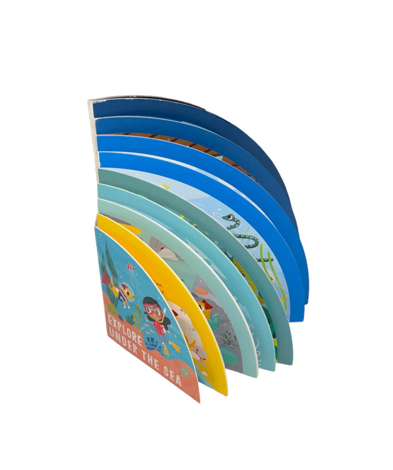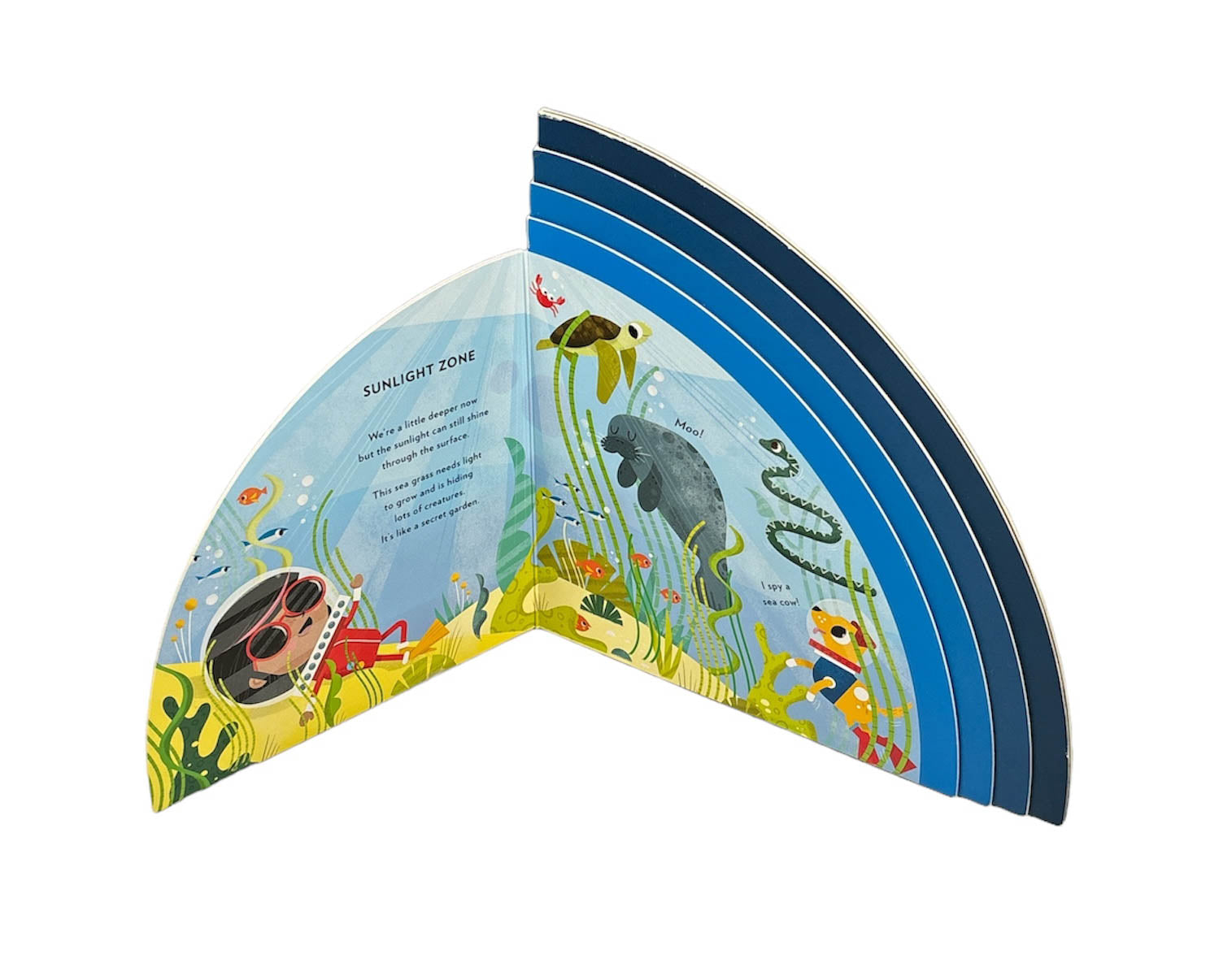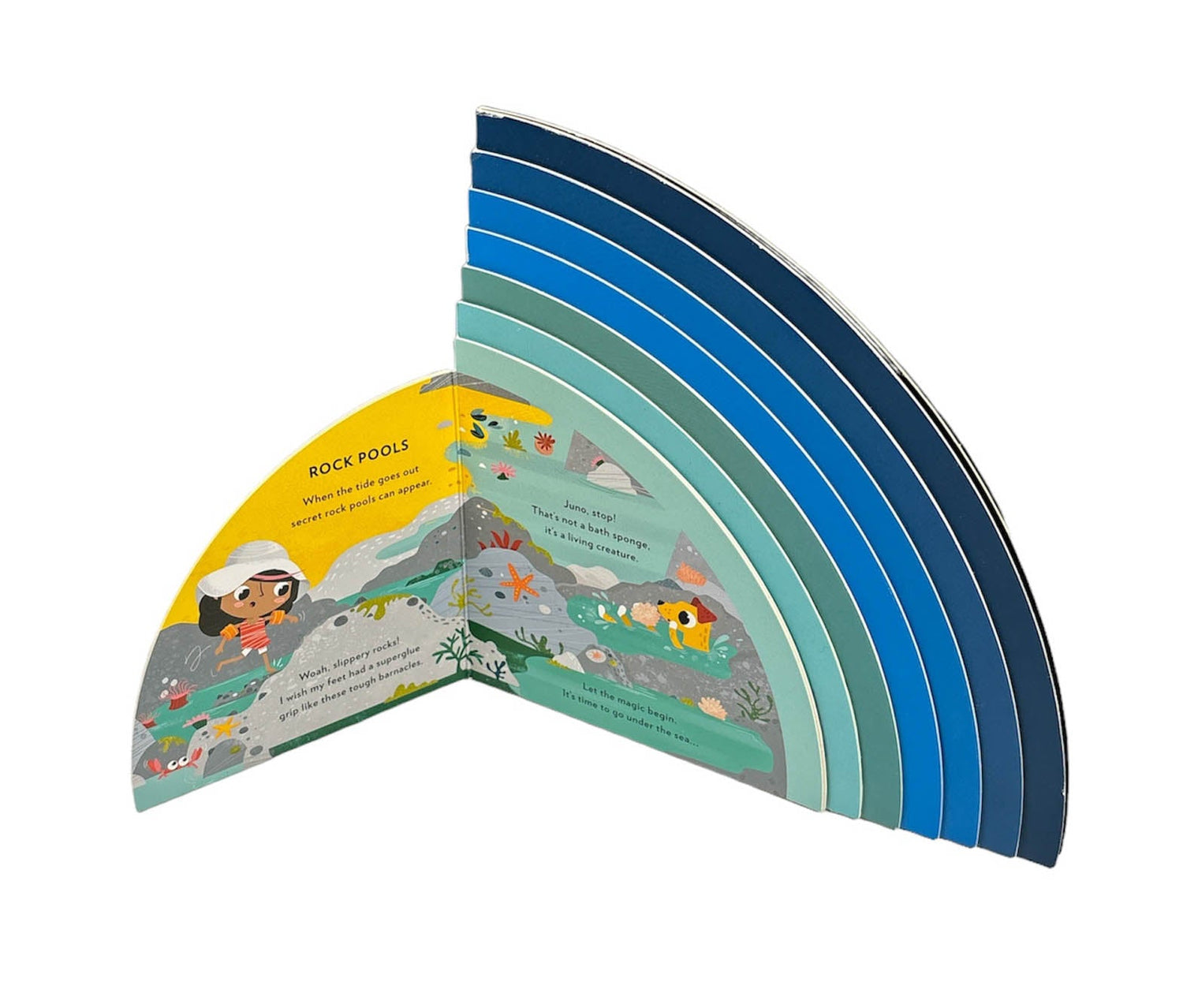 Evie and her pet dog, Juno, use their senses to explore the ocean in this bright, layered board book.