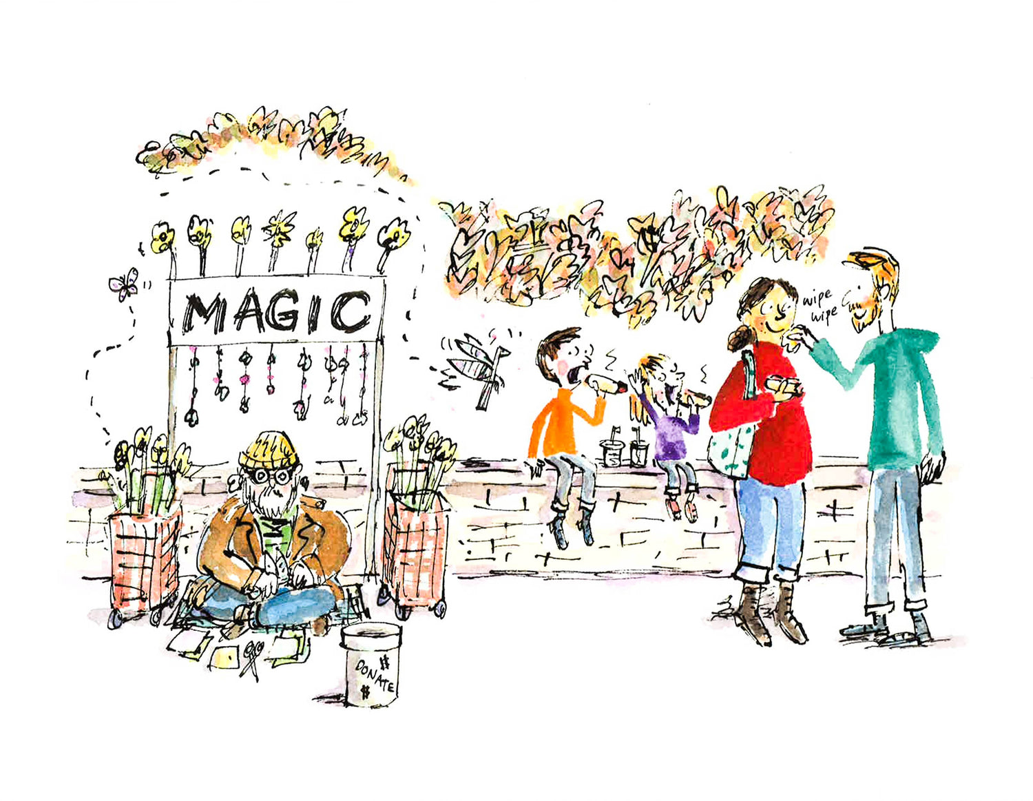 When a family goes to a local museum, a boy notices a homeless man sitting outside, making brightly colored origami birds. He convinces his dad to buy a bird the man makes just for him.