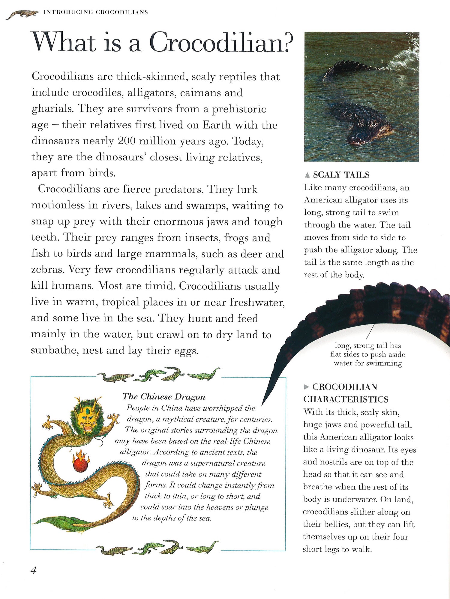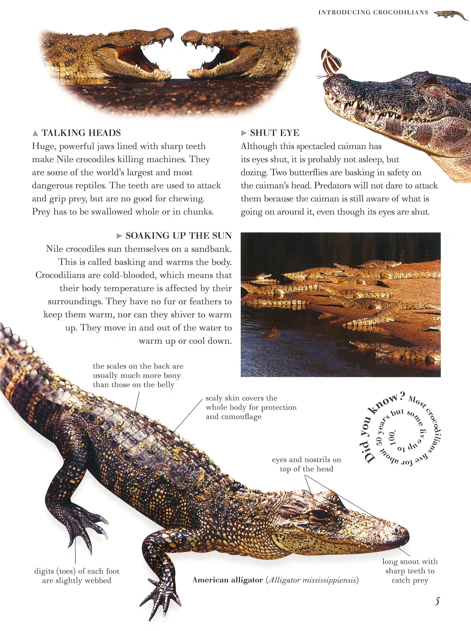This title looks at the fascinating world of crocodiles, alligators, caimans and gharials, shown in over 180 exciting images. You can find out about one of the most ancient and deadly reptiles on the planet. You can see how crocodiles work, their different shapes and sizes, their teeth and senses, and how they interact. It is packed with over 180 stunning pictures from renowned wildlife photographers and artists. Detailed cross-sections and diagrams reveal the complex inner workings of a crocodilian's body. It is ideal for home and school use for 8- to 12-year-olds. It is the winner of the Key Stage 2 non-fiction category of the English Association's 4-11 Awards for best children's illustrated book. In the murky swamps of the world's tropical regions dwells a group of primitive but fearsome predators - the crocodilians. This exciting and informative book investigates every aspect of their lifestyles, and the differences between alligators, crocodiles, caimans and gharials. It reveals the gentle, nurturing side of crocodilian nature, and how they enjoy social get-togethers, as well as their lethal hunting skills. This is the perfect book to inspire young readers for school projects, home study, or just to learn for fun.